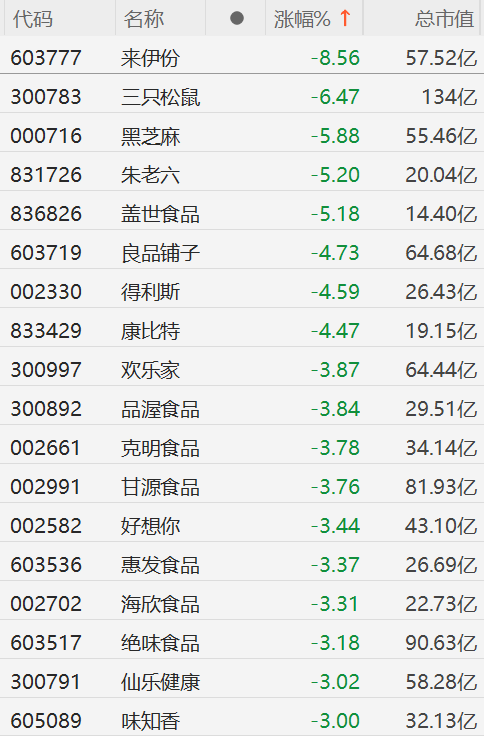 格隆汇1月22日|A股市场食品股震荡走低,其中,来伊份(603777)跌超8%,三只松鼠(300783)跌超6%,黑芝麻(000716)、朱老六、盖世食品跌超5%,得利斯(002330)、康比特跌超4%,欢乐家、品渥食品、克明食品、甘源食品、好想你(002582)、惠发食品(603536)、海欣食品(002702)、绝味食品(603517)、仙乐健康、味知香跌超3%。 (责任编辑:宋政 HN002)