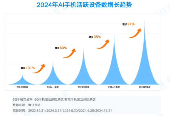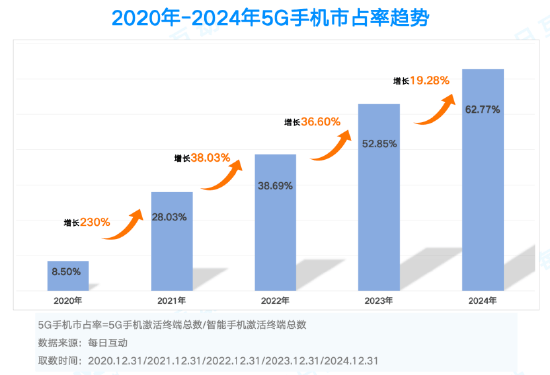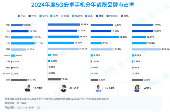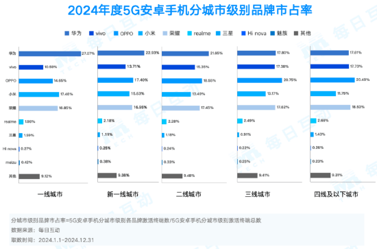 岁末年初,总会有一系列总结要做。在2024年的5G智能手机市场上,又发生了哪些让人激动的瞬间?哪些新机型的发售让粉丝们魂牵梦萦?新技术的应用又是否引发了行业格局震荡?在这些变化之后,各大手机厂商的市场表现如何?每日互动大数据持续关注国内5G手机市场, 为大家带来关于5G智能手机的“请回答,2024”。 据中国信息通信研究院数据,2024年1-11月,国内市场5G手机出货量为2.41亿部,占国内手机市场总体出货量的86.2%,同比增长12%。5G手机已成为市场主流。每日互动大数据洞察发现,5G手机市场活跃设备数在经历了2020-2021年的井喷式增长后逐年趋向平稳。时至今日,5G手机整体市占率已达到62.77%,在智能设备领域呈现绝对优势。 Apple连续称霸,others蠢蠢欲动 显然现阶段苹果的降价策略是有效的。每日互动大数据显示,虽然面临众多国产品牌,2024年苹果系列手机的整体市占率仍高达32.72%,整体霸榜年度5G手机品牌市占率榜首。此外others(其他)行列份额进一步扩大,较上年度同期增长129%,较2024年中增长14.34%,国内5G市场未来变局让人更加期待。铁打的老大,扩张的小弟,夹在中间的国产四巨头华米OV市场份额均有不同程度回落。值得关注的是,自从魅族靠“all in Ai”掀了“传统”5G手机的桌子,2024全年一直稳中有进。这样的表现在年度热门5G机型排行中将更加明显。 荣耀真荣耀,华为有作为 对于iPhone13大家心中都一个问题,“廉颇老矣,尚能饭否?”就年度受欢迎机型排名来看,一部iPhone13似乎给苹果上了“保险”。从2021年9月上市至今,同时期的安卓机或许被下架、或许离场,但iPhone13因为有iOS系统的加持,价格也逐渐亲民,到现在仍在参与市场博弈,并成为用户口中的“十三香”。此外,在24年的年度热门5G机型Top20 榜单上,荣耀、华为和vivo、OPPO顶住iPhone家族围剿的压力,硬生生在榜上撕出一条口子。荣耀X50连续上榜,并较24年年中市占率提升13.33%。华为Mate60Pro稳定在第17位,并较年中提升7.8%。 荣耀、华为双双飞升,MOTO上演“甄只毓 在品牌新增市占率排行榜方面,我们看到了一个睽违多时的名字,“摩托罗拉”。随着折叠屏产品的流行,这个4G时代前的“王者”凭借竖向折叠屏等产品创新再次回到大众视野。此外,荣耀、华为表现不俗。每日互动大数据显示,2024年四季度,荣耀当季新增市占率达到14.38%,位居第二,同比增长51.85%,较24年年中增长12.61%;华为当季新增市占率12.28%,同比增长26.86%。这也是两大品牌近两年在季度新增榜单上取得的最好位次。除了津津乐道的品牌忠诚度,2024年两支国货劲旅一面在高端市场大势回归,一面在中低端市场持续发力,加之价格刺激,终在第四季度功成名就。 每日互动大数据显示,荣耀X50成为2024年四季度5G安卓手机新增市占率榜首。而华为Mate 60系列和Pura 70系列的全线回归,更使得华为在四季度安卓市场上表现亮眼。2024四季度5G安卓手机新增市占率排行榜中,这两大系列共上榜4款机型。当然眼尖的读者在这份榜单上也发现了小米15和小米14的身影。据雷军介绍,小米15系列自上市以来便受到了市场的热烈追捧,在不到十天的时间内便实现了超过一百万台的销售业绩,充分展示了其强大的市场号召力。 小米全线增长,魅族再获关注 就安卓智能手机品牌的城市等级分布来看,华为在一线、新一线城市的霸主地位不可撼动;同时在二线、三线和四线及以下城市进一步扩张,市占率同比分别取得11.89%、13.38%和11.17%的涨幅。2024年小米稳稳发力,全线城市市占率均得到提升;此外魅族手机自从去年一季度再获关注以来,不能说高歌猛进,实际上也在稳步增长,尤其在一线、新一线及二线城市等重要战场,相比2024年中,分别取得了7.7%,11.8%及10%的增长战绩。 华为的全线进击也表现在对不同年龄段用户的吸引力上。每日互动大数据发现相比去年年中,25-34岁,35-44岁及45岁+这三大群体对华为手机的接受度均在提升;而在18-24岁年龄段的市场霸主,仍旧是OV轮番与小米一较高下。 AI、三折屏接连上场,“富豪”人群热衷尝鲜 说到2024,逃不开的话题就是AI。这一年,不仅AI应用开始走进普通人的生活,AI功能在智能手机上的搭载以及基于AI的原生开发让国内手机厂商卷出天际。每日互动大数据洞察发现,2024年一季度AI手机设备量暴增,较上季度增长131%;之后市占率维持在持续稳定增长,直到下半年增长趋势开始放缓。 而此前火爆的折叠屏市场虽然在24年一度遇冷,但是华为三折叠手机的推出重新给“折叠屏”带来热度。每日互动大数据对华为三折叠手机用户进行洞察,发现该用户群体画像呈现出以下特点:多为高线城市高收入群体,其一线城市TGI达到2.09,高消费水平特征达到1.90,具有较强的经济实力支撑其购买高端产品。年龄分布上,热爱尝鲜的25-34岁年轻群体和经济收入相对稳定的35-44岁群体特征明显。这些用户对科技产品有较高的接受度和追求,注重产品的创新性和独特体验。同时,相较女性,华为三折叠手机的男性用户特征更加明显,达到1.32,是女性用户特征的2倍。 2019年,中国5G商用元年开启。此后,5G手机出货量逐年攀升。时至今日,智能手机市场的新技术和新动态更加令人目眩。AI技术不断提升手机智能体验,折叠屏技术也在轻薄化和耐用性上取得突破,手机卫星通信技术加速发展引发头部企业积极布局。手机的形态变了,功能变了,对人们生活的改变也正在加速。智能手机已