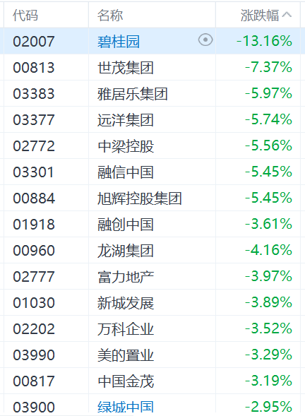 格隆汇1月22日|港股内房股全线下跌,其中,碧桂园跌超13%,世茂集团跌超7%,雅居乐、远洋集团、中梁控股、融信中国、旭辉跌超5%,龙湖集团跌超4%,融创中国、富力地产、新城发展、万科企业、美的置业、中国金茂跌超3%。 (责任编辑:宋政 HN002)