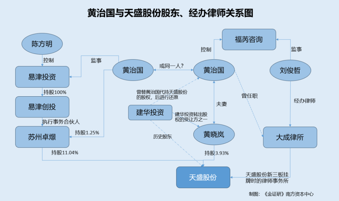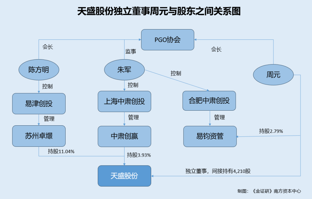 《金证研》南方资本中心 池恩/作者 易溪 南江 映蔚/风控 此番冲击北交所上市,南通天盛新能源股份有限公司(以下简称“天盛股份”)其中拟募资5,000万元补充流动资金。而在天盛股份向北交所递交申请撤回上市申请文件的次日,天盛股份发布公告称预计2025年度使用闲置自有资金购买理财产品,金额不超过2亿元。 值得注意的是,天盛股份独董周元持有原董事朱军控制的有限公司所管理的私募基金份额,并任行业协会专职会长,而天盛股份多个客户系协会会员。另外,历史股东建华(上海)股权投资基金管理中心(有限合伙)(以下简称“建华投资”)曾替黄治国代持天盛股份的股份,该隐名股东黄治国与天盛股份私募股东的合伙人之一“同名”。而此次股权代持解除,即通过新三板市场向指定的主体出售该部分股权中,股权受让方包括黄治国的妻子黄晓岚。且黄治国与天盛股份新三板挂牌时的经办律师刘俊哲曾系同事,且两人曾投资同一企业,两者关系待解。 一、独董持有原董事控制的有限公司所管理的私募份额,任职协会的多名会员系天盛股份客户 上市公司独立董事应当具备独立性。研究发现,独立董事周元持有天盛股份原董事朱军控制的有限公司管理的私募资金的份额。此外,周元还系PGO协会专职会长。巧合的是,天盛股份的多个客户均系该协会的成员。 1.1 周元系天盛股份独立董事,其间接持有天盛股份4,210股股份 据天盛股份签署于2021年10月15日的2021年第三次临时股东大会决议公告,2021年10月15日,天盛股份股东大会审议同意周元担任天盛股份独立董事,任期自股东大会审议通过之日起至第二届董事会届满之日止。 据天盛股份2024年半年报,截至2024年6月末,周元任天盛股份独立董事,任期为2023年12月14日至2026年12月13日。周元间接持有天盛股份4,210股股份,持股比例为0.0081%。 1.2 天盛股份原董事朱军系中肃资本创始人,周元持有朱军控制的合肥中肃创投所管理的私募基金2.79%份额 据天盛股份签署于2023年12月25日的招股说明书(以下简称“签署于2023年12月25日的招股书”),截至签署日2023年12月25日,周元对外投资单位包括合肥易钧财赢投资管理中心(有限合伙)(以下简称“易钧资管”),投资金额为150万元,投资比例为2.79%。 据中国证券投资基金业协会,截至查询日2025年1月20日,易钧资管系私募基金,编号为SM0119,基金管理人系合肥中肃创业投资有限公司(以下简称“合肥中肃创投”)。其中,合肥中肃创投系朱军控制的企业。 据签署于2023年12月25日的招股书及签署于2016年7月6日的公开转让说明书(以下简称“公开转让说明书”),2015年8月至2023年10月,朱军任天盛股份的董事。合肥中肃创投、上海中肃创业投资管理有限公司(以下简称“上海中肃创投”)均系天盛股份原董事朱军担任执行董事兼总经理的企业。 据中肃创投官网信息,截至查询日2025年1月20日,朱军系中肃资本的创始合伙人、董事长。此外,朱军曾任易津资本创始合伙人、总裁。 1.3 朱军曾任职的易津创投所管理的基金,与其控制的上海中肃创投管理的基金系天盛股份股东 据签署于2023年12月25日的招股书,截至2023年12月25日,苏州卓G投资中心(有限合伙)(以下简称“苏州卓G”)、平阳中肃创赢股权投资合伙企业(有限合伙)(以下简称“中肃创赢”)系天盛股份的股东,持股比例分别为11.04%、3.93%。 据天盛股份2024年半年报,截至2024年6月末,苏州卓G仍持有天盛股份11.04%的股份。 其中,据证券投资基金业协会,截至查询日2025年1月20日,中肃创赢的基金管理人系上海中肃创投。上海中肃创投的实控人系朱军。 此外,苏州卓G的执行事务合伙人系上海易津创业投资管理有限公司(以下简称“易津创投”)。截至签署日2023年12月25日,宁波晶玺投资合伙企业(有限合伙)(以下简称“晶玺投资”)、易津创投、宁波梅山保税港区中肃创庆投资合伙企业(有限合伙)(以下简称“中肃创庆”)分别持有苏州卓G24.6%、0.01%、2.81%的份额。 据证券投资基金业协会,截至查询日2025年1月20日,易津创投的实际控制人系陈方明。 据市场监督管理局,截至查询日期2025年1月20日,晶玺投资的股东为上海易津投资股份有限公司(以下简称“易津投资”)、中肃创庆,执行事务合伙人系易津投资。 需要说明的是,易津投资持有易津创投51.76%的股权。陈方明控制易津投资。此外,中肃创庆系天盛股份原董事朱军控制的企业。 公开信息显示,陈方明系易津资本的创始人。 据中国证券投资基金业协会信息,2009年11月至2018年3月,朱军任易津投资总经理。2015年10月至2018年7月,朱军任易津创投总经理。 也就是说,陈方明、朱军均系易津资本的创始人。2018年,朱军不再任易津创投总经理,并在外设立中肃资本。朱军、陈方明分别系上海中肃创投和易津创投的实控人,上海中肃创投管理的私募基金中肃创赢,易津创投管理的私募基金苏州卓G,系天盛股份的股东。且朱军、陈方明均间接持有苏州卓G的份额。 1.4 周元、朱军分别系PGO协会的会长、监事,天盛股份多个客户系该协会的核心成员单位 据签署于2023年12月25日的招股书,2015年3月至签署日2023年12月25日,周元系PGO绿色能源产业发展促进会(以下简称“PGO协会”)专职副会长、会长。 据PGO协会官网信息,2013年8月,中国电子科技集团、中国国电、招商局、中国保利等七家央企共同发起成立了光伏绿色生态合作组织(Photovoltaic Green-ecosy