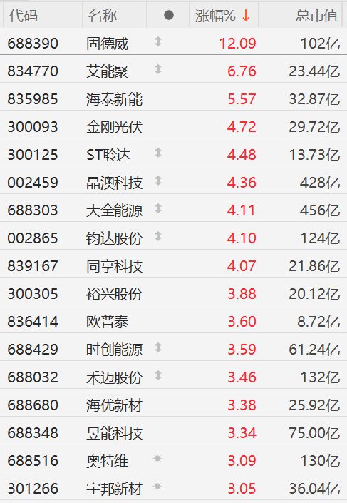 格隆汇1月23日|A股市场光伏设备板块拉升,其中,固德威涨12%,艾能聚涨超6%,海泰新能涨超5%,金刚光伏、晶澳科技、大全能源、钧达股份(002865)、同亨科技涨超4%,禾迈股份、海优新材、昱能科技涨超3%。 (责任编辑:宋政 HN002)