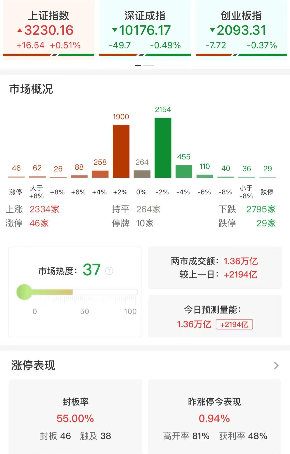 格隆汇1月23日丨A股三大指数全天上演冲高回落行情,沪指盘中一度涨超1.8%,创业板指一度涨超2%。截至收盘,三大指数涨跌不一,沪指涨0.51%,深证成指跌0.49%,创业板指跌0.37%。两市个股跌多涨少,下跌个股近2800只,盘中一度超5000股上涨;两市全天成交1.35万亿元,较上一日放量成交2166亿元。 大金融走强,天茂集团(000627)、华林证券(002945)涨停,新华保险(601336)、光大银行(601818)涨超6%;教育、地产、文化传媒领涨,贵金属、电脑硬件、汽车跌幅居前。 (责任编辑:宋政 HN002)