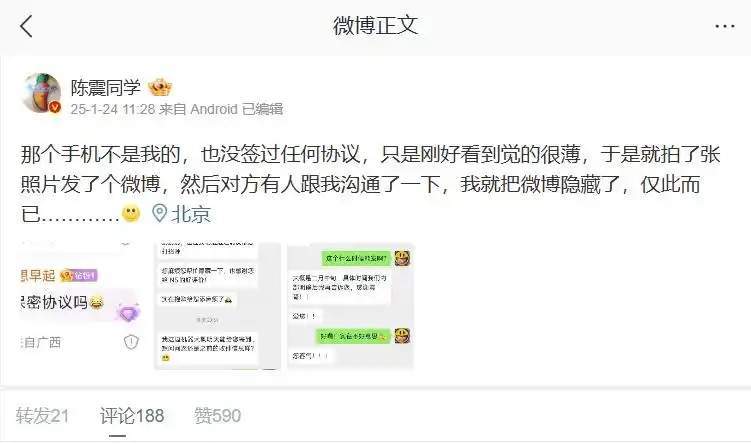 仟茂科技讯 1月24日午间消息,继泄密领克900赔偿500万之后,知名汽车博主“陈震同学”再次因为泄密事件登上微博热搜。 据悉,昨日他在微博上晒出了OPPO Find N5折叠屏手机的真机照片,但这款手机尚未正式发布,依旧处于保密状态。 对此,陈震回应称,“那个手机不是我的,也没签过任何协议,只是刚好看到觉的很薄,于是就拍了张照片发了个微博,然后对方有人跟我沟通了一下,我就把微博隐藏了,仅此而已。” 在1月初,陈震因为提前发布了领克旗舰SUV领克900的视频而收到了领克官方的律师函。1月20日,陈震在其个人社交媒体上发出了赔付领克500万违约金的转账记录,并称自己将引以为戒。 此前,陈震曾在微博解释了提前发布视频的原因。他表示自己已经收到了领克的律师函,也会针对此次事故将积极配合解决后续问题。“我给同行造成了很多焦虑,非常对不起。负责更新视频的同事已自动离职,接下来我们会检讨现有的流程,优化内容更新,以杜绝此类事件的再次发生。” 来源:仟茂网 (责任编辑:宋政 HN002)