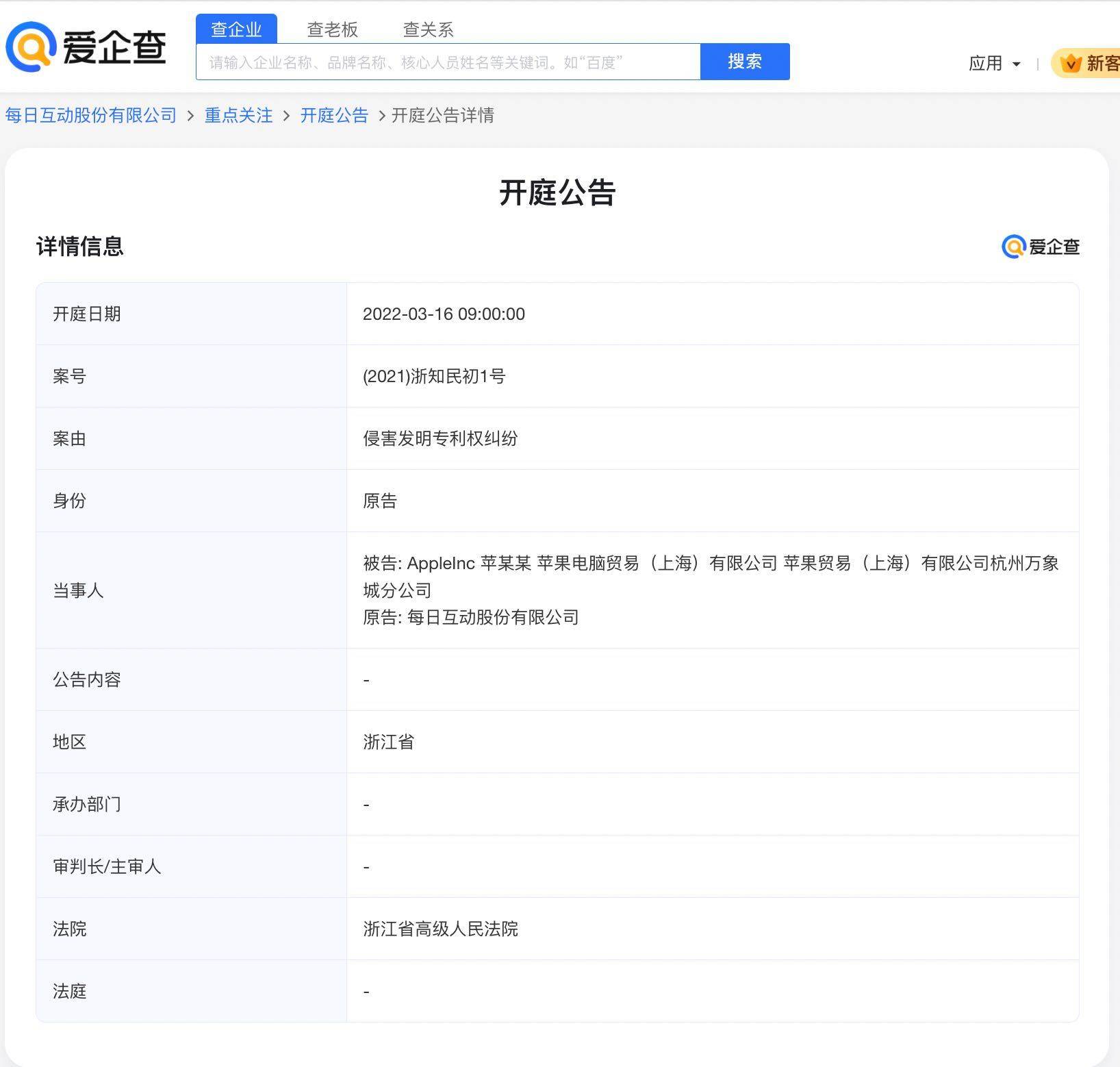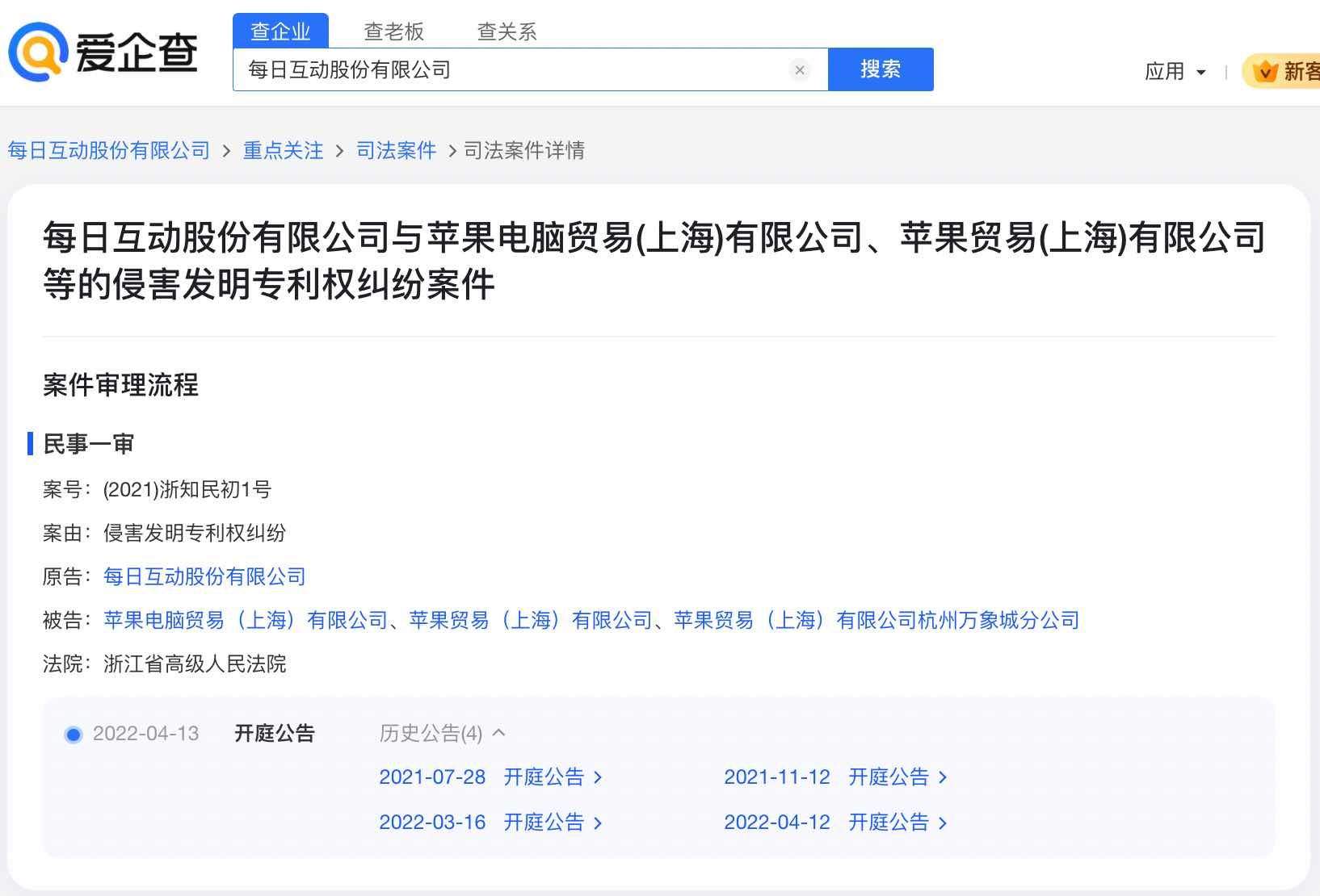 凤凰网科技讯 1月24日,据爱企查显示,近日,每日互动股份有限公司发布《关于累计诉讼、仲裁的公告》。根据公告显示,每日互动在浙江省高级人民法院起诉苹果公司侵害发明专利,主张被起诉方赔偿公司经济损失1亿元,并赔偿公司因维权产生的律师费、公证费等合理费用300万元,合计金额1.03亿元。目前本案的状态是等待开庭。 图源 爱企查 爱企查App显示,2021年,每日互动股份有限公司因侵害发明专利权纠纷,起诉苹果电脑贸易(上海)有限公司等,受理法院为浙江省高级人民法院。 图源 爱企查 (责任编辑:贺 )