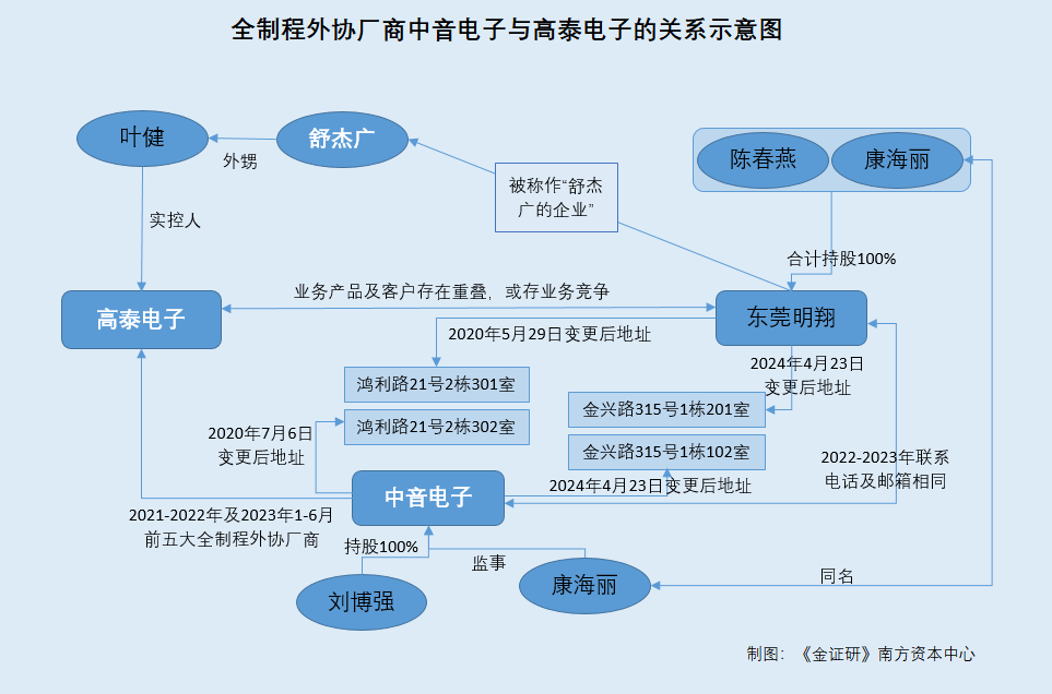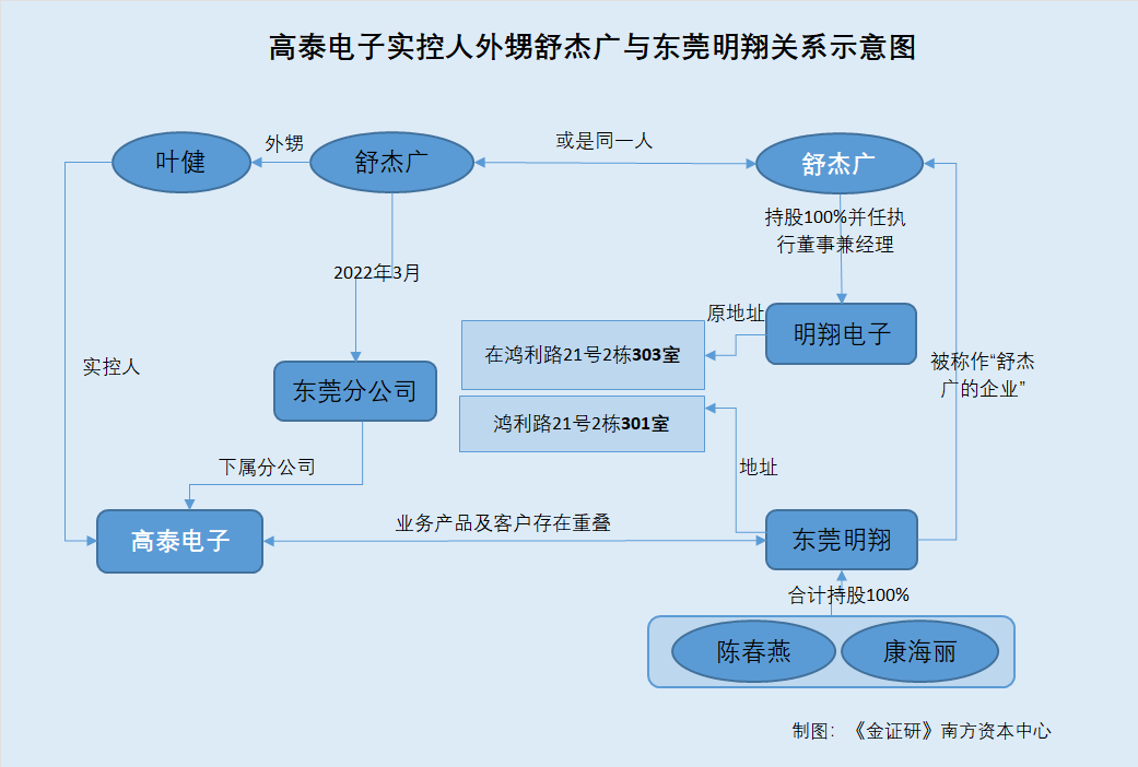 《金证研》南方资本中心 罗九/作者 南江 映蔚/风控 2025年1月8日,苏州高泰电子技术股份有限公司(以下简称“高泰电子”)终止上交所主板上市注册程序,彼时距离其递交注册已经过去了一年多的时间。回溯高泰电子的上市历程,或非一路坦途,早在提交注册之前,高泰电子曾因聘请的证券服务机构被证监会采取限制业务活动的监管措施,而中止其发行注册程序。 而高泰电子“撤材料”或非偶然,早在2023年11月至2024年8月,《金证研》南北资本中心曾发布三份研究报告,指出高泰电子此番上市或存不少问题待解。其中,此次上市,高泰电子收入增长可持续性遭问询,但高泰电子却预测期后即2023年业绩增速下滑,且其超七成收入的下游行业或“遇冷”,成长能力或承压。而高泰电子近三年产能利用率持续下滑,仍募资扩产的情况同样值得关注。另一方面,监管聚焦上市前突击“清仓式”分红行为,而高泰电子报告期内累计分红逾3亿元,且合计分红额占同期净利润的比例超50%。此外,高泰电子核心技术人员从老东家离职未满一年即贡献专利。 值得注意的是,辅导备案当年“突击”入股的两名股东,与高泰电子新增的一名前五客户背后的关系值得关注。该客户报告期内为高泰电子贡献超九千万元的收入,其子公司与高泰电子实控人对同一合伙企业出资。不仅如此,两名新增股东,系该客户的关联方控制的基金。另一方面,高泰电子的子公司一项基地建设项目建设超三年或未“如约”竣工,此番上市拟募资4.3亿元建设二期工程。 此外,高泰电子的关联方异象频出。报告期内,高泰电子的子公司从关联方处受让商标,招股书却“只字不提”。不仅如此,高泰电子实控人控制企业曾与第三方注册地址、联系方式重叠,与此同时,招股书披露该同一控制下的关联方无经营业务,而历史上该关联方曾以高泰电子分公司“自居”,2021年11月还备案申报了新建设项目。且高泰电子两版招股说明书关于原材料的采购数据现“两个版本”,信披质量或遭拷问。 回溯历史,高泰电子自2006年设立以来主营印刷、模切业务,主营产品为电子级追溯产品、复合功能性器件,2016年开始向上游复合功能性材料领域拓展。报告期内,2019-2022年期间,高泰电子复合功能性材料收入增长额占营收增长额超七成。而复合功能性材料行业或属于完全竞争市场,市场竞争激烈。向上游拓展的同时,高泰电子的复合功能性材料产销量或远不及同行业可比公司,且其发明专利数量也不敌复合功能性材料的同行业可比公司。 另一方面,实控人外甥舒杰广或在外控股一家企业东莞市明翔电子技术有限公司(以下简称“明翔电子”),明翔电子于2024年9月注销。蹊跷的是,另外一家同在东莞的企业,业务或与高泰电子存重叠,却被称为“舒杰广的企业”,该企业还与高泰电子的零人外协供应商共用联系方式,该两家在东莞的企业与高泰电子实控人外甥舒杰广的关系或待解。此外,高泰电子出现董秘现身为专利发明人的情形,而董秘的任职履历显示其或不具备技术背景。 一、预测业绩负增长,向上游领域拓展背后或专利数量“垫底”产销量不及同行 营业收入及净利润等财务数据是企业经营成果的关键指标。2019-2022年,高泰电子业绩在加增长后放缓,高泰电子预测其2023年出现业绩下滑。2019-2022年期间,高泰电子复合功能性材料收入增长额占营收增长额超七成。就该业务而言,复合功能性材料或市场竞争激烈,而高泰电子该产品的产销量或不及其同领域的同行。 1.1 预测2023年业绩负增长,2019-2022年期间复合功能性材料收入增长额占营收增长额超七成 据高泰电子签署日期为2023年2月26日的招股说明书(以下简称“签署于2023年2月26日的招股书”)及签署日期为2023年11月8日的招股书明书(以下简称“签署于2023年11月8日的招股书”),2019-2022年,高泰电子的营业收入分别为1.75亿元、2.33亿元、3.6亿元、3.95亿元,2020-2022年分别同比增长32.86%、54.67%、9.86%。 2019-2022年,高泰电子的净利润分别为0.87亿元、1.09亿元、1.76亿元、2.27亿元,2020-2022年分别同比增长25.99%、61.28%、28.54%。 2023年1-9月,高泰电子的经审阅的营业收入、净利润分别为2.21亿元、1.04亿元,分别同比增长-26.69%、-37.34%。 2023年,高泰电子预计营业收入为3.16亿元至3.26亿元,相较上一年的同比增长率为-19.95%至-17.47%;预计的归母净利润为1.48亿元至1.56亿元,相较上一年的同比增长率为-34.72%至-31.09%。 在前后两轮问询中,高泰电子分别被问及期后经营业绩及收入增长持续性。 对于业绩下滑情形,高泰电子表示,高泰电子下游应用领域主要集中于电脑,报告期内收入占比超过80%。2023年以来,由于宏观经济环境不佳,使得大众消费延迟、电脑更新换代意愿下降,从而导致全球电脑出货量下滑,对产业链相关企业均造成了不同程度的影响。由此也导致高泰电子2023年1-6月业绩出现下滑。而收入下降是短期性的,持续经营能力不受影响。随着需求复苏,未来电脑出货量的增长,将使得高泰电子收入同步增长。 据签署于2023年2月26日的招股书及签署于2023年11月8日的招股书,高泰电子的主要产品为复合功能性器件、复合功能性材料、电子级追溯产品。截至2022年,高泰电子的复合功能性材料、复合功能性器件及电子级追溯产品的收入分别为1.88亿元、1.4亿元、0.5亿元,占主营业务收入比例分别为48.03%、35.8%、12.78%。 经测算,相