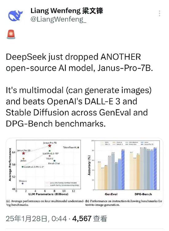 仟茂科技讯 1月28日上午消息,深度求索(DeepSeek)创始人梁文锋深夜发文官宣,DeepSeek刚刚发布并开源了一款名为Janus-Pro-7B的多模态AI模型,可以生成图像。 据梁文锋介绍,在 GenEval和DPG-Bench基准测试中,Janus-Pro-7B击败了OpenAI的DALL-E3和Stable Diffusion。” 仟茂科技了解到,就在今日凌晨,DeepSeek工程师们已经在Hugging Face平台上传了Janus Pro 7B和1.5B模型。这俩模型是去年DeepSeek 10月发布的Janus模型升级版。 据DeepSeek介绍,Janus-Pro是一个新颖的自回归框架,统一了多模态理解和生成。Janus-Pro 是基于 DeepSeek-LLM-1.5b-base/DeepSeek-LLM-7b-base 模型构建的。 在多模态理解任务中,Janus-Pro 采用 SigLIP-L 作为视觉编码器,支持 384 x 384 像素的图像输入。而在图像生成任务中,Janus-Pro 使用一个来自特定来源的分词器,降采样率为 16。(文猛)