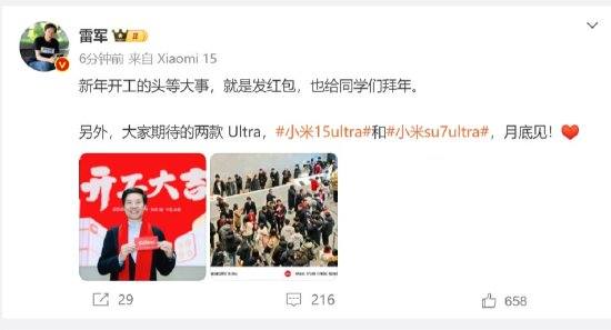 仟茂科技讯 2月5日上午消息,雷军今日在微博发文称,“新年开工的头等大事,就是发红包,也给同学们拜年。另外,大家期待的两款Ultra,小米15 Ultra和小米SU7 Ultra,月底见!” 他此前透露,小米SU7 Ultra今天样车陆续到达全国42城112店。 责任编辑:郝欣煜 (责任编辑:张晓波 )
