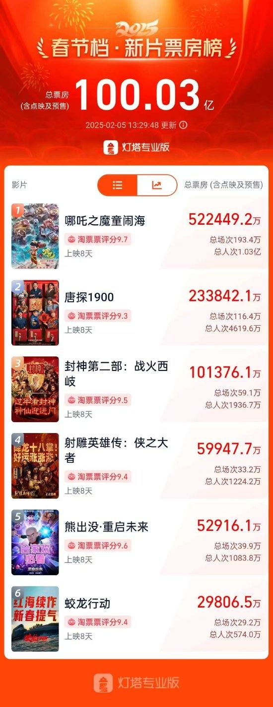 仟茂科技讯 2月5日下午消息,据灯塔专业版,截至2月5日13时29分,2025年春节档上映新片(含春节档结束后)总票房(含点映及预售)突破100亿。
