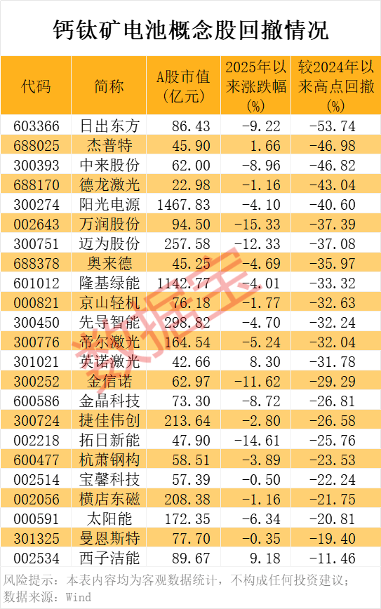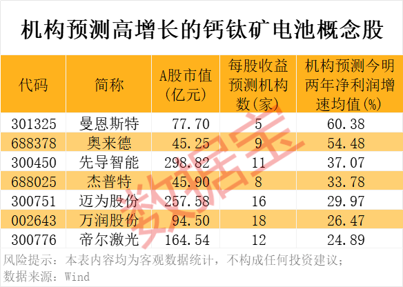 数据是个宝 数据宝 投资少烦恼 在“双碳”目标下,光伏行业潜力巨大,钙钛矿技术是未来促进产业发展的重要角色之一。 存储芯片午后突然拉升 蛇年春节后首个交易日,上证指数高开低走,截至收盘下跌0.65%。科创50指数表现突出,开盘涨幅接近3.6%,收盘涨幅收窄至2.9%。成交方面,A股合计成交1.3万亿元,较上个交易日放量1727亿元,环比增幅达到15.32%。 中兴通讯成交额再次破百亿元,夺得今日成交额冠军,收盘涨幅为6.45%。中芯国际、中际旭创(300308)、浪潮信息(000977)、科大讯飞(002230)、中科曙光(603019)等成交额均超80亿元,这5只股票中仅中际旭创股价下跌,收盘跌幅达到14.43%。春节前1个交易日,中际旭创股价大跌10.47%,最新收盘价已跌破百元,与2024年10月8日创下的历史高点相比,回撤幅度达到47.13%。 盘面上,与AI应用相关的概念股走势强劲,DeepSeek概念、智谱AI、华为算力、Sora概念、多模态AI等板块收盘涨幅超5.5%。 午后,存储芯片午后逆势冲高,西测测试、大为股份、北京君正下午开盘后快速拉升,并触及涨停。截至收盘,西测测试、大为股份封住涨停板,北京君正(300223)、恒烁股份、同有科技、华海诚科、朗科科技(300042)、联芸科技等涨超7%。 柔性叠层太阳电池取得突破 近日,西湖大学未来产业研究中心、工学院王睿团队在柔性叠层太阳电池领域取得了重要突破,成功让钙钛矿与铜铟镓硒这两种材料叠在一起,使得光电转换效率达到23.4%。相关研究论文近日发表于《自然・光子学》。 如果把单结钙钛矿太阳电池比作一块“单层蛋糕”,叠层太阳电池便是多层口味的。不同口味的蛋糕层对应不同的半导体材料层,每一层都能“捕捉”特定波长的太阳光。这样一来,它就能吸收比“单层”电池更广泛的太阳光能量,更高效地将太阳光转化为电能,从而突破单结太阳电池转换效率天花板。 据悉,该团队成功让钙钛矿与铜铟镓硒这两种不同口味的“蛋糕”叠在一起。这种柔性轻薄的叠层太阳电池厚度仅相当于一根头发丝的直径,有望在未来应用到建筑、汽车、飞行器、柔性可穿戴设备等不规则表面。 钙钛矿叠层电池是一种新型太阳能(000591)电池,由晶硅和钙钛矿两种材料组合吸光,相较传统晶硅电池具有发电成本低、光电转换效率高的特点。近年来,国内在钙钛矿电池技术方面持续取得突破,为行业迈向产业化落地提供更多可能。 当前,钙钛矿电池正处于商业化的重要转折点。随着钙钛矿电池技术的持续进步和创新,预计未来几年内,我国钙钛矿电池的渗透率将迎来显著提升。从中国光伏行业协会(CPIA)预测来看,到2030年钙钛矿电池的市场渗透率有望达到30%,届时市场规模将超过800亿元,年复合增长率高达80%。 据经济观察网,协鑫集团董事局主席朱共山接受采访时表示,到2025年,钙钛矿叠层组件的产能将陆续放量,2026年实现大规模制造,2027年全面实现叠层产能大爆发。 概念股普遍回撤明显 A股市场上,涉及钙钛矿电池产业的上市公司超过20家,部分公司在产品落地方面进展较快。捷佳伟创自主研发的大规格钙钛矿涂布设备已正式交付客户,将并入其研发中试线正式生产,帮助客户完善钙钛矿电池产业化工艺路线。 宝馨科技前瞻布局钙钛矿+异质结叠层电池研发及产业转化研究,目前公司团队的钙钛矿/异质结叠层电池实验室自测效率已超32%。 曼恩斯特钙钛矿产品订单涵盖GW、中试以及实验型涂布系统,且覆盖单结、叠层设备,其中GW级钙钛矿涂布系统(涂宽2.4米)继首台出货后,再次中标行业头部客户。 拓日新能的钙钛矿电池研发项目正处于实际生产线量产化实验阶段,目前实验在效率方面有得到提升。 先导智能自主研发生产的钙钛矿GW线激光划线设备顺利出货,已发往国内行业头部客户现场。 作为新能源赛道的重要细分领域,钙钛矿电池概念过去一段时间的整体走势不尽如人意。据数据宝统计,截至2月5日收盘,最新收盘价较2024年以来高点相比,钙钛矿电池概念股回撤均值达到31.79%。日出东方、中来股份(300393)、杰普特、德龙激光、阳光电源回撤幅度超40%。 机构关注度来看,有11只概念股获机构“积极型”(含买入、增持、强烈推荐等)评级。阳光电源最受青睐,共获38家机构评级;其次是隆基绿能、捷佳伟创(300724)、万润股份(002643)、迈为股份等。 未来增长潜力方面,根据5家以上机构一致预测,今明两年净利润增速均有望超20%的仅7只,分别是曼恩斯特、奥来德、先导智能(300450)、杰普特、迈为股份(300751)、万润股份、帝尔激光。 以曼恩斯特为例,国海证券(000750)研报显示,公司同宇树科技强强联手,打造四足与人形机器人成长新路径。考虑到公司涂布模头行业地位稳固,储能业务快速扩张,同时布局多种新技术领域,成长潜力较大。 声明:数据宝所有资讯内容不构成投资建议,股市有风险,投资需谨慎。 数据宝(shujubao2015):证券时报智能原创新媒体。 本文首发于微信公众号:数据宝。文章内容属作者个人观点,不代表和讯网立场。投资者据此操作,风险请自担。 (责任编辑:宋政 HN002)