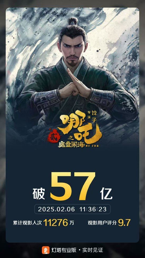 仟茂科技讯 2月6日上午消息,据灯塔专业版实时数据,截至2月6日11时36分,影片《哪吒之魔童闹海》票房突破57亿,进一步逼近《长津湖》的57.75亿元。分析观点认为,预计今日《哪吒之魔童闹海》将登顶中国影史票房榜。 责任编辑:郝欣煜 (责任编辑:张晓波 )