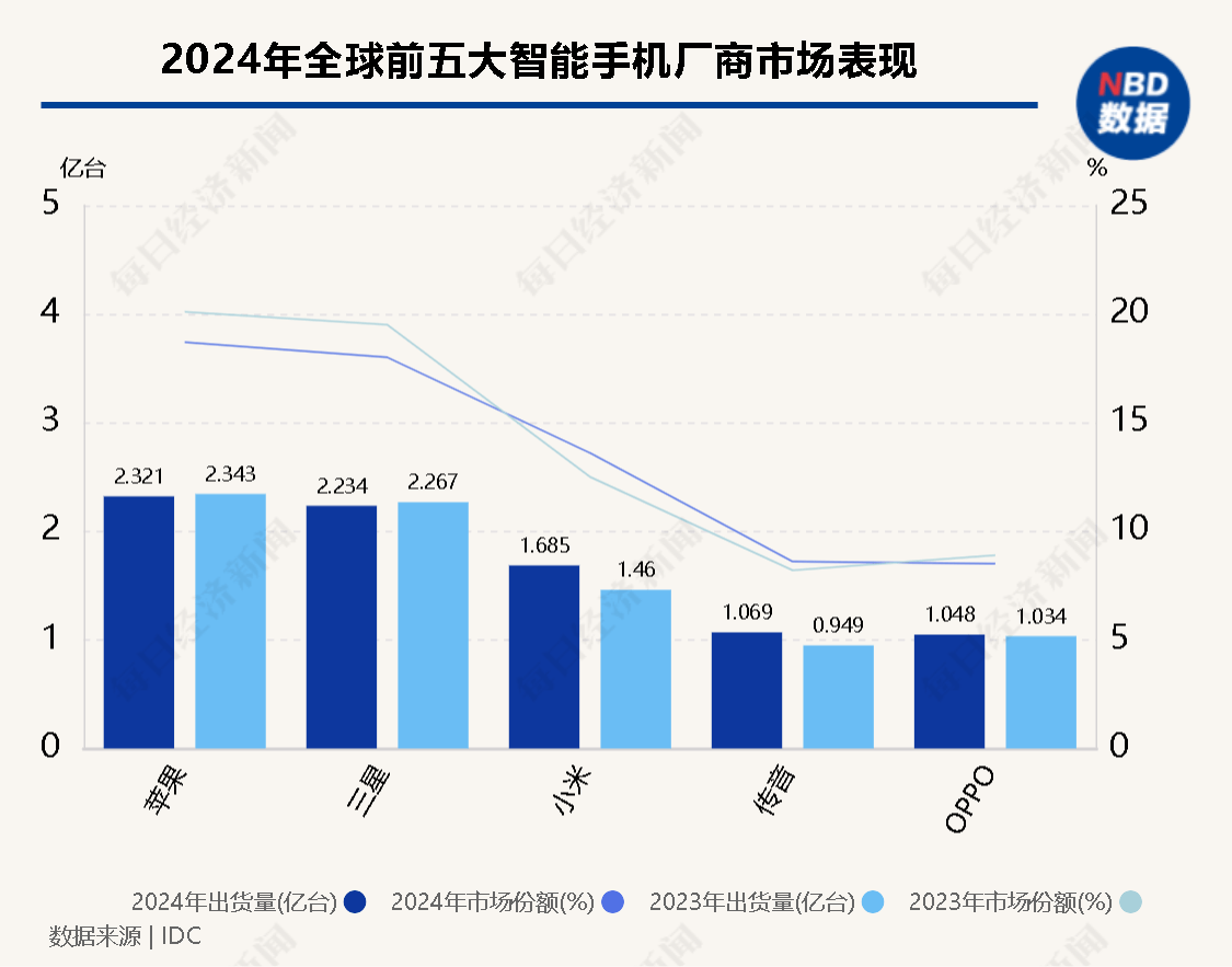 国产手机厂商在全球市场的总出货量创出历史新高。 调研机构国际数据公司(IDC)发布的数据显示,2024年第四季度,中国手机企业(小米、OPPO、vivo、荣耀、华为、联想、realme、传音等)的总出货量占据全球智能手机的56%。 虽然核心市场仍然是亚洲,但国产手机品牌正在迅速扩大其在世界各地的影响力――凭借着出色的本地化,中国品牌在非洲取得了亮眼的成绩;在欧洲,中国手机品牌正朝着高端迈进。 近日,《每日经济新闻》记者在采访中发现,当前中国手机厂商在全球市场的发展早已走过拓荒期,完成“基本盘”的布局。接下来,国产手机品牌高端机型继续走在挑战苹果、三星的道路上,对于中国本土市场来说,全球市场再战高端仍是2025年的关键词。尽管高端绝对销量仍稍逊一筹,但已经有较好的起势信号。 1月20日,手机“国补”正式上线。有分析认为,“国补”政策有效刺激了消费需求,有助于手机厂商提前释放销量,进而改变全年手机销售曲线。2025年,中国智能手机产业有望实现进一步增长。 从亚洲到非洲,国产手机开疆拓土 在这个全球化的市场中,有的企业选择先发展欧美市场再回到东南亚市场,有的第一站就会选择东南亚,但无论选择哪种出海策略,东南亚都是一个绕不过去的重要市场。 凭借部分可借鉴的市场经验与极具竞争力的产品,中国手机厂商们在东南亚智能手机市场如鱼得水。 调研机构Canalys发布的2024年第三季度数据显示,东南亚智能手机市场同比增长15%,达到2500万台。 其中,OPPO以510万台的出货量和21%的市场份额领跑东南亚智能手机市场;传音以400万台出货量和16%的市场份额位居第三;小米位列第四,市场份额为15%,出货量为390万台。前五名中,vivo的出货量为260万台,市场份额为10%。 可以看出,中国手机厂商在东南亚的合计占比已逾六成,并且通过过去十多年的布局,它们在东南亚市场的发展也早已过了“拓荒”阶段。 南亚的印度市场也是国产手机激烈争夺的焦点。小米、OPPO、vivo、realme、一加等越来越多的中国选手一方面正在挑战韩国三星电子等老牌领军企业,另一方面也撼动了Micromax、Lava、Intex等根基深厚的印度本土品牌。 Canalys发布的数据显示,从2024年全年来看,vivo、小米、三星、OPPO和realme(脱胎于OPPO的中国独立手机品牌)分别位列前五,对应的市场份额分别为19%、17%、17%、12%和11%,在印度市场,“中国军团”占比达到59%。 与其他国产手机厂商不同,传音手机在国内市场踪迹难觅,但却因为巅峰时期曾占据非洲市场57%的份额,被外界称为“非洲之王”。 传音控股(688036.SH)总部位于深圳,主要产品为TECNO(中高端品牌)、itel和Infinix(大众品牌)三大品牌手机,包括功能机和智能机。近年来,随着非洲手机市场竞争加剧,传音份额较高点有所下滑。IDC数据显示,截至2024年6月末,传音在非洲智能手机市场的占有率超过40%,仍排名第一。 传音控股的成功主要在于对产品的本地化,如调整摄像头以适应非洲人较深肤色和多SIM卡功能,同时传音控股还实施多元化战略,开发了数码配件、家用电器以及移动互联网服务。扩品类业务方面,公司创办数码配件品牌oraimo与家用电器品牌Syinix及售后服务品牌Carlcare,智能终端操作系统包括HIOS、itelOS、XOS等,创建了一个增强品牌忠诚度和市场渗透的生态系统。 不过,伴随着各大手机厂商同样进入东南亚、非洲、拉美等新兴市场,传音控股的竞争压力也在不断增加。2024年第一季度,传音控股营业收入为174.43亿元,同比增长88.10%,归母净利润为16.26亿元,同比增长210.3%。2024年第二季度,公司营业收入、净利润分别降为171.15亿元、12.26亿元。 就2024年第二季度公司业绩下滑,传音控股曾在公告中解释称:“公司在非洲手机市场优势地位的基础上,持续推进其他新兴市场拓展,同时继续加大力度、加快发展移动互联、扩品类等业务,逐步构建起智能终端与移动互联业务均衡协同发展的生态。公司将进一步加大研发投入,在影像、游戏、AI、充电、基础体验等技术航道构建核心能力。” 冲击欧洲市场:用好产品赢得认同,市场反馈超预期 与国产厂商在东南亚、南亚和非洲市场一路高歌不同的是,欧洲市场作为全球手机品牌的高地,充满了不确定性与挑战。 在Counterpoint Research公布的2024年第一季度欧洲市场数据中,三星(32%)和苹果(25%)的合计份额高达57%;国产手机厂商中,小米在欧洲的市场份额为18%,realme和荣耀的市场份额均为4%。 然而,Counterpoint Research数据显示,2019年以前,中国品牌在欧洲的整体市场份额最高峰时接近40%。其中,华为、小米以及OPPO更是在2019年第四季度挤入了欧洲市场的前五位。该机构认为,三星和苹果在欧洲尤其是更加固化的西欧市场有十分坚固的用户基础以及国内厂商难以比拟的品牌知名度,其建立起来的竞争壁垒在短时间内依旧难以被超越。但国内厂商过去通过更加激进的产品策略以及定价策略,已开始接近头部厂商的份额。 然而,由于与诺基亚的法律纠纷以及荣耀的崛起,OPPO(包括一加)自2020年第二季度以来首次跌出欧洲智能手机市场份额前五名。2023年vivo也受到诺基亚4G标准必要专利影响退出部分欧洲市场。2024年年初,伴随着专利纠纷的解决,OPPO和vivo去年也重拾了对欧洲市场的布局。对于在欧洲的布局,vivo执行副总裁、首席运营官胡柏山日前表示:“对欧洲市场来讲,我们目前还在探索阶段,希望在欧洲与vivo一起成长