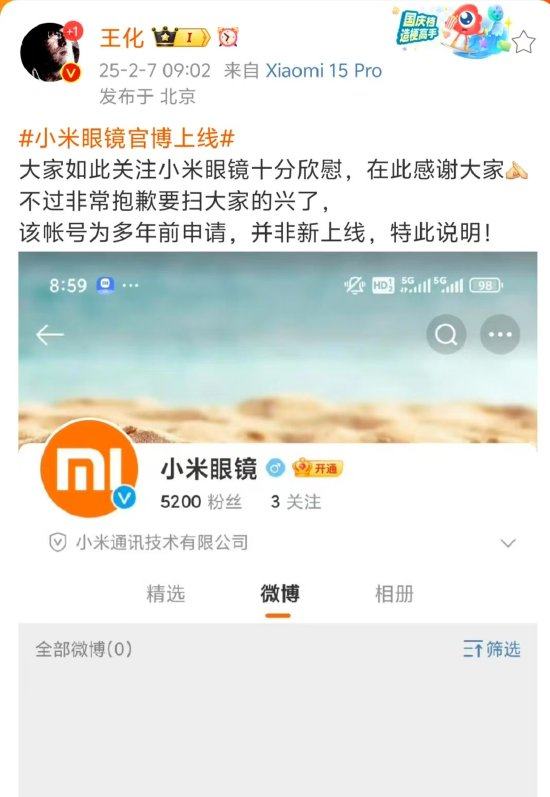 仟茂科技讯 2月7日上午消息,昨日有消息称,小米眼镜官微已经上线,业内猜测小米即将入局百镜大战,引发广泛关注。 今日上午,小米集团公关部总经理王化微博发文表示,“大家如此关注小米眼镜十分欣慰,在此感谢大家,不过非常抱歉要扫大家的兴了,该帐号为多年前申请,并非新上线,特此说明! ” (责任编辑:王治强 HF013)