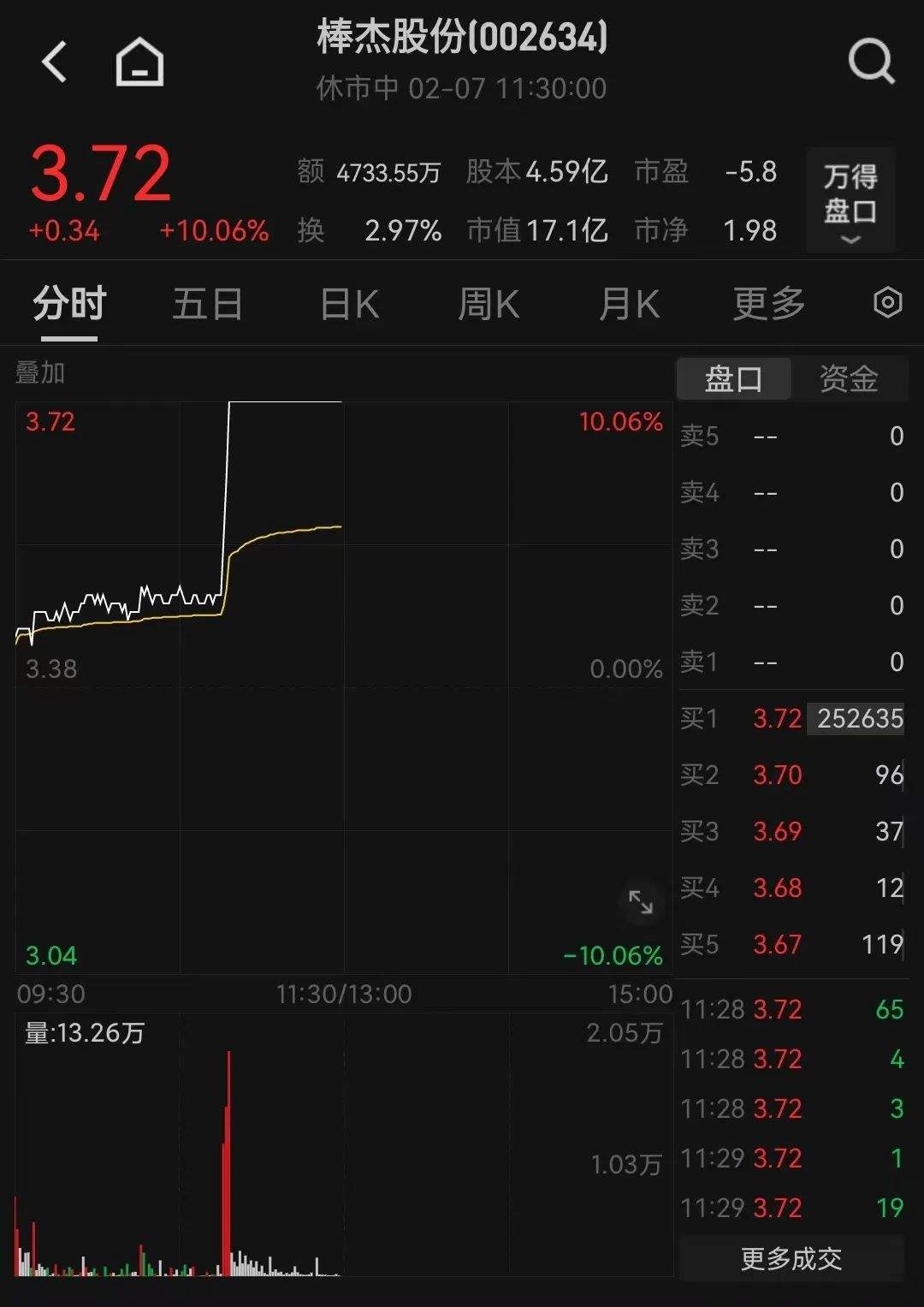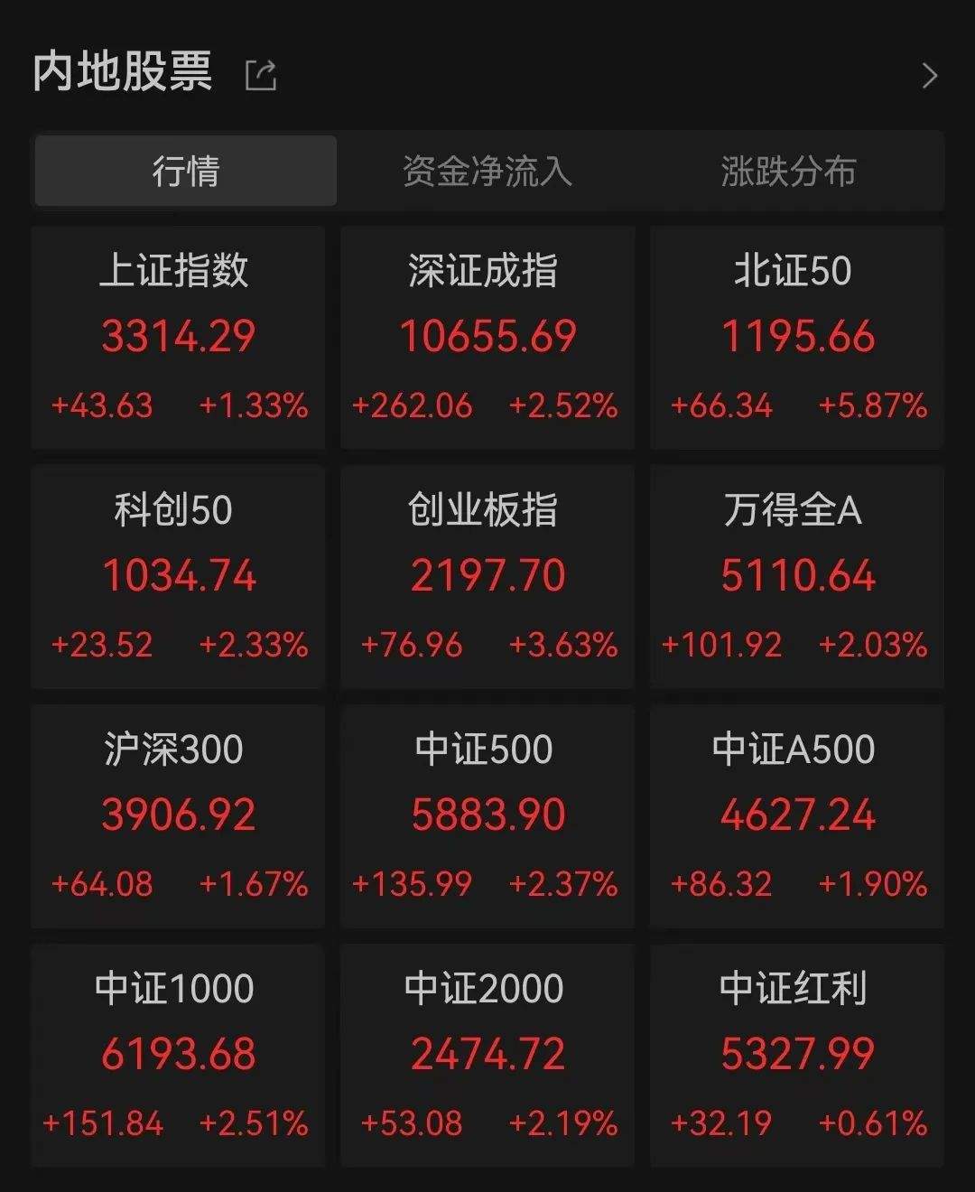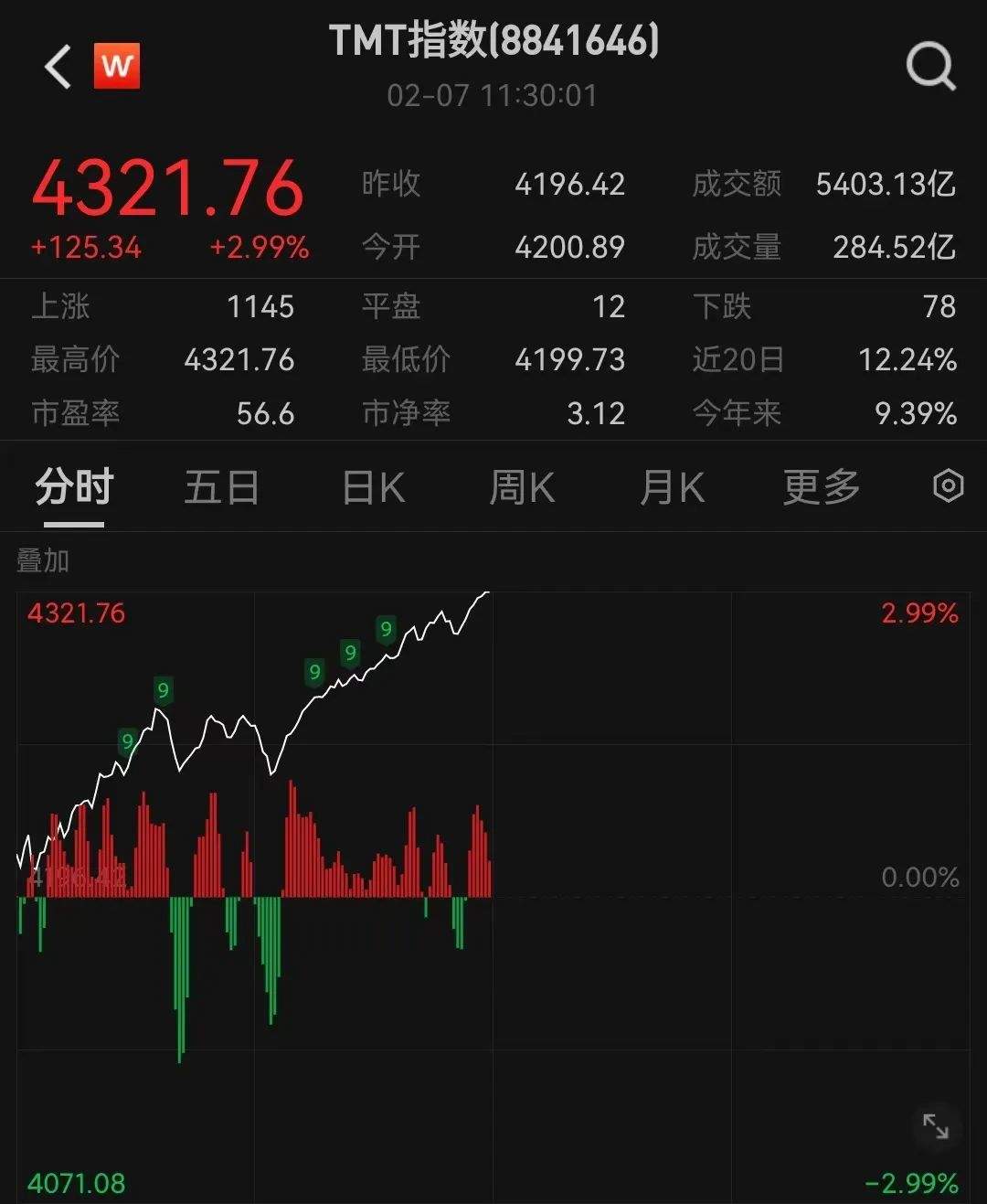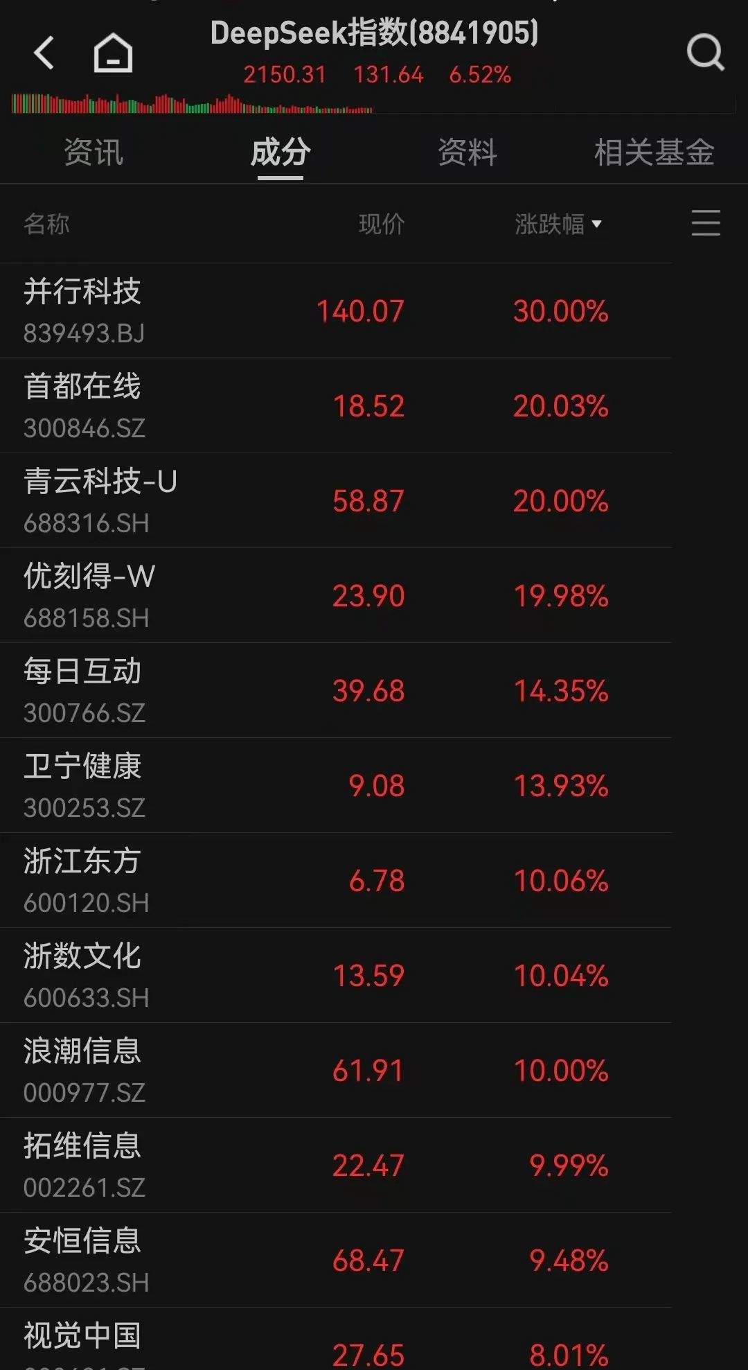 全线爆发! 今天上午A股市场整体进一步上行,截至中午收盘,上证指数涨超1%,重新站上3300点整数关口;深证成指涨超2%,创业板指数涨超3%,北证50指数涨近6%,TMT赛道继续走强。 DeepSeek概念再度成为亮点,整体继续上行,盘中多股涨停,不过多家相关公司也开始提示投资风险。 港股市场今天上午整体上行,截至发稿,恒生指数涨超1%,恒生科技指数涨近3%。 此外,富时A50指数期货亦快速翻红,涨超1%。 A股大涨 上证指数站上3300点 今天上午A股市场整体进一步上行,上证指数盘中重新站上3300点整数关口,创业板指数和北证50指数表现更佳。截至中午收盘,上证指数上涨1.33%,深证成指上涨2.52%,创业板指数上涨3.63%,科创50指数上涨2.33%,北证50指数上涨5.87%。 行业板块和赛道方面,房地产板块大幅上涨,中洲控股(000042)盘中涨停,龙头股万科A盘中涨幅一度接近9%。 TMT赛道继续走强,万得TMT指数盘中涨幅逼近3%,上一交易日该指数大涨3.74%。该赛道中,IT设备、通信设备等板块涨幅居前。 券商板块盘中出现一波拉升,板块涨幅超3%。其中,华林证券(002945)盘中直线封板,国金证券(600109)涨近9%,锦龙股份(000712)、东方财富(300059)、国元证券(000728)涨超5%,中信证券(600030)涨超4%。 银行、电力等板块上午表现相对疲弱。 A股市场部分个股波动剧烈。比如瀛通通讯(002861)早盘一度大跌逾6%,但后来突然直线拉升至涨停。 另外,临近上午11点,棒杰股份(002634)也直线拉升,并冲上涨停。 DeepSeek概念整体继续上行多家公司提示风险 DeepSeek概念整体继续上行。万得DeepSeek概念指数盘中涨幅超过6%。该指数的成份股中,并行科技盘中“30cm"涨停,首都在线、青云科技-U、优刻得-W盘中“20cm"涨停,每日互动(300766)盘中涨幅超过14%,浙江东方(600120)、浙数文化(600633)、浪潮信息(000977)、拓维信息(002261)、视觉中国(000681)等多股盘中涨停。 部分相关公司发布公告,提示风险。比如青云科技昨晚发布公告称,经自查,公司注意到相关平台将公司股票纳入DeepSeek概念股。公司就相关事项澄清说明如下:DeepSeek系开源大语言模型,任何用户皆可免费基于该模型开展训练工作,进而进行个性化开发或模型优化,以满足不同用户在多元场景下的特定需求。公司旗下部分产品也进行了DeepSeek的接入,但目前相关业务情况及对公司未来业绩贡献存在重大不确定性,请广大投资者审慎决策、理性投资。 另外,青云科技公告还称,经核实,截至公告披露日,公司未直接或间接持有杭州深度求索人工智能基础技术研究有限公司(DeepSeek是杭州深度求索人工智能基础技术研究有限公司旗下的大模型)公司股权。除上述事项外,公司未发现其他可能对公司股票交易价格产生较大影响的、需要公司澄清或回应的媒体报道或市场传闻。 优刻得昨晚也发布公告表示,经公司自查,并书面征询公司控股股东、实际控制人及其一致行动人,截至本公告披露日,公司控股股东、实际控制人及其一致行动人不存在影响公司股票交易异常波动的重大事项;不存在其他应披露而未披露的重大信息。公司目前生产经营正常,生产经营未发生重大变化。 优刻得表示,DeepSeek为开源大模型,各家厂商均可根据自身需求对其进行模型的适配与本地化部署,任何用户可免费基于该模型开展相关业务。公司近期也与DeepSeek进行了全系列模型适配工作,目前相关业务效果及对公司未来业绩贡献存在重大不确定性。 优刻得称,经核实,截至公告披露日,公司未直接或间接持有杭州深度求索人工智能基础技术研究有限公司股权。公司提醒,公司股价短期波动幅度较大,敬请广大投资者注意投资风险,理性决策,审慎投资。 港股拉升 港股市场上午上行,截至发稿,恒生指数盘中涨幅超过1%,恒生科技指数涨近3%。 恒生指数成份股中,联想集团、吉利汽车、信义光能等涨幅居前。 小米集团表现也较好,盘中股价再创历史新高。 其他股价大幅波动的港股中,KEEP股价大涨,盘中涨幅一度超过20%。 本文首发于微信公众号:证券时报。文章内容属作者个人观点,不代表和讯网立场。投资者据此操作,风险请自担。 (责任编辑:宋政 HN002)