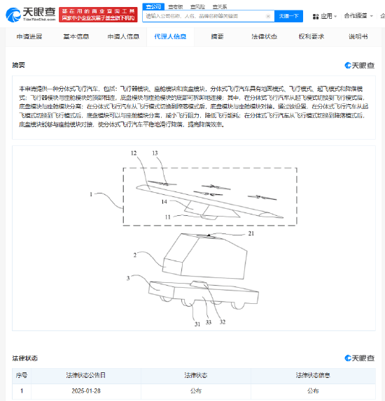 仟茂科技讯 2月7日上午消息,天眼查App显示,近日,清华大学、奇瑞汽车股份有限公司申请的“分体式飞行汽车”专利公布。 摘要显示,本申请提供一种分体式飞行汽车,包括:飞行器模块、座舱模块和底盘模块,分体式飞行汽车具有地面模式、飞行模式、起飞模式和降落模式;飞行器模块与座舱模块的顶部相连,底盘模块与座舱模块的底部可拆卸地连接;其中,在分体式飞行汽车从起飞模式切换到飞行模式后,底盘模块与座舱模块分离;在分体式飞行汽车从飞行模式切换到降落模式后,底盘模块与座舱模块对接。通过该设置,在分体式飞行汽车从起飞模式切换到飞行模式后,底盘模块可以与座舱模块分离,减小飞行阻力,降低飞行能耗;在分体式飞行汽车从飞行模式切换到降落模式后,底盘模块能够与座舱模块对接,使分体式飞行汽车平稳地滑行降落,提高降落效率。 责任编辑:郝欣煜 (责任编辑:张晓波 )
