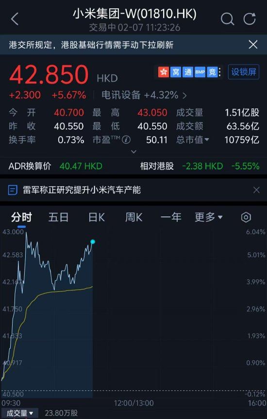 仟茂科技讯 2月7日上午消息,截至发稿,小米集团涨超5.67%,股价再创历史新高,市值突破万亿人民币,达到10759亿。
