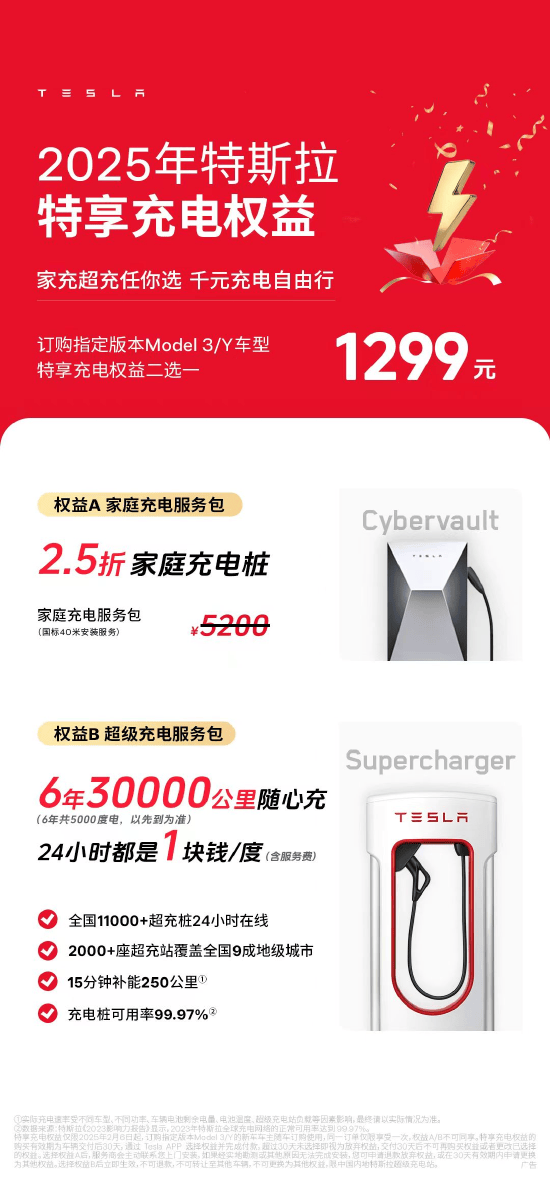 仟茂科技讯 2月7日午间消息,近日,特斯拉中国发布特享充电权益二选一政策:1299元买下价值5200元的Cybervault家充桩(含国标40米安装服务),或者1299元获得6年3万公里(以先到者为准)内,享受特斯拉全国超级站1元/度电(含服务费)的超级充电价格。 据悉,特斯拉在中国内地拥有超过11500根超级充电桩,100%覆盖中国大陆地区所有省份和直辖市,覆盖全国9成地级城市;在全球拥有超过6万根超充桩。据了解,今年搭载特斯拉最新充电技术的V4超级充电站还会登陆中国内地。 近日,特斯拉还推出了Model 3史上最大力度的优惠组合拳:限时保险补贴8000元+5年0息政策+特享充电权益,相比原价买下Model 3长续航版+家充桩,总共能省下71000元。 责任编辑:王进和 (责任编辑:张晓波 )