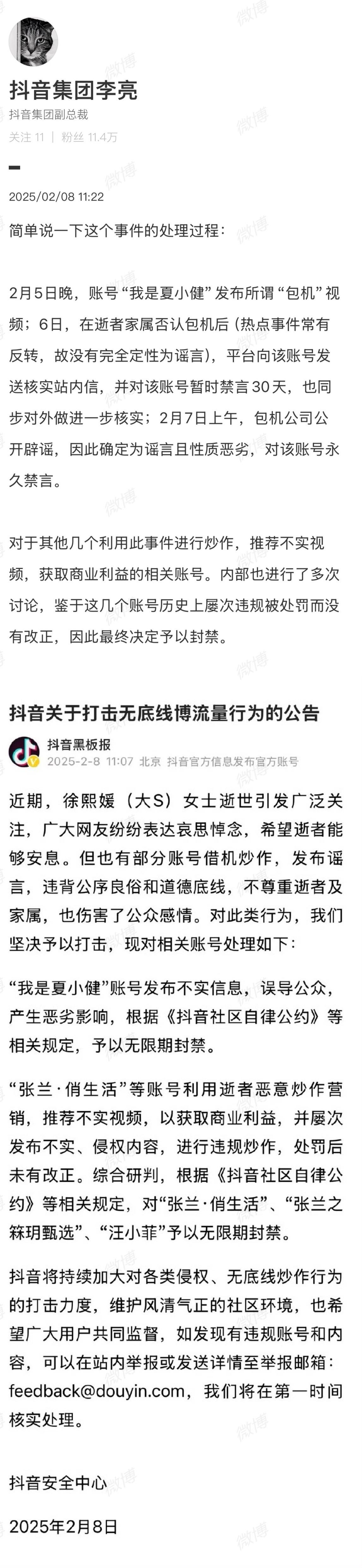 凤凰网科技讯 2月8日,抖音安全中心发布关于打击无底线博流量行为的公告,汪小菲、张兰等账号被无限期封禁。随后抖音集团副总裁李亮发文回应,称这几个账号“历史上屡次违规被处罚而没有改正,因此最终决定予以封禁。” 以下是回应原文: (责任编辑:董萍萍 )