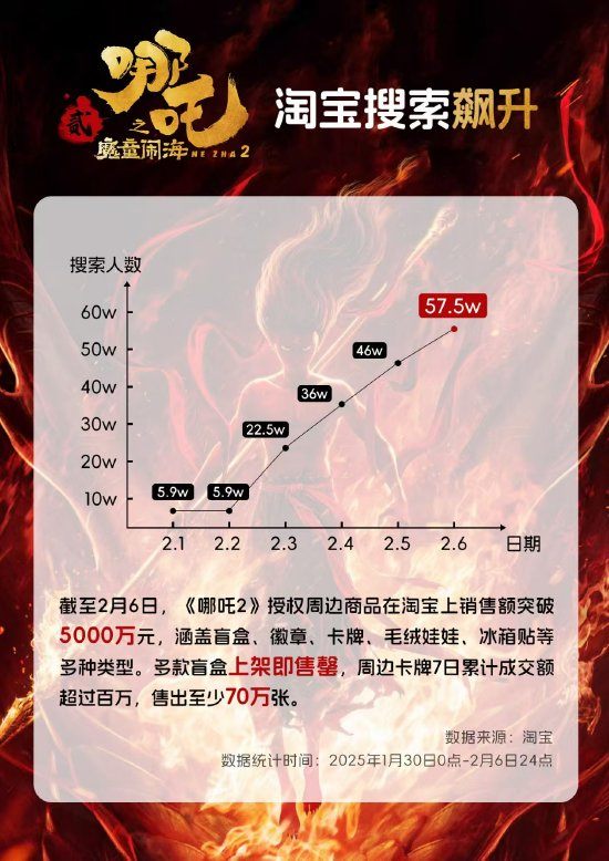 仟茂科技讯 2月8日下午消息,从淘宝了解到,目前平台上由饺子创作的哪吒系列形象授权周边在平台上销售额已经突破了5000万。其周边种类也覆盖了盲盒、卡牌、毛绒、搪胶娃娃、胶片卡、冰箱贴、徽章、贴纸等数十种,且成交量还在继续飙升。 其中,泡泡玛特于1月30日在天猫官方旗舰店发售《哪吒之魔童闹海》天生羁绊系列手办盲盒,平均每天超过2万人在线搜索,上线仅8天时间销售额迅速破千万。天猫相关负责人表示,该盲盒后续会不定期补货,但每日问询的粉丝依然不在少数。 获得官方授权的卡游官方旗舰店、集卡社旗舰店也上新了《哪吒之魔童闹海》的周边卡牌,仅一周时间,相关卡牌卖出超过70万张,累计成交额突破百万。 除了已经在售的周边商品,FunCrazy塑料主义、阿里鱼旗下品牌“造点新货”也在淘宝上发起了周边众筹项目,获取官方授权并达到目标众筹金额后,不仅能够“发车”出更丰富的周边样式,参与众筹的网友也能通过众筹价格购买,还可以获得加赠的徽章、贴纸套装、胶片卡等同系列周边。目标筹款10万元的众筹手办,目前在淘宝已经众筹到了超过1800万元。 天猫玩具潮玩行业相关负责人表示,《哪吒2》相关商品的搜索和成交的增长是爆炸式的,平均每天较前一日有超过10万的搜索人数增长,这种情况在近几年的IP衍生品销售中非常罕见,作为开年最火爆的IP,预计这股“哪吒旋风”还能再刮至少1个月的时间。 《哪吒2》的爆火也为哪吒这一神话形象带来了巨大流量,淘宝相关负责人谈到,上美影旗舰店《哪吒闹海》系列周边,90后回忆杀动画片《哪吒传奇》系列周边也在近期迎来了成交的可观增长。(闫妍) 责任编辑:王若云 (责任编辑:张晓波 )