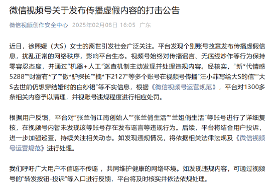 仟茂科技讯 2月8日下午消息,微信视频创作安全中心下午发布《微信视频号关于发布传播虚假内容的打击公告》,公告称,近日,徐熙媛(大S)女士的离世引发社会广泛关注。平台发现个别账号故意发布传播虚假信息,扰乱正常的网络秩序,影响平台生态。视频号始终对传播谣言、无底线炒作等行为保持零容忍态度,并通过“机器+人工”巡查机制主动发现并处理违规内容。经核实,“新*代情感5288”“财富有*了”“傲*驴探长”“拽*下2127”等多个账号在视频号传播“汪小菲写给大S的信”“大S去世前仍想穿结婚时的白纱裙”等不实信息,根据《微信视频号运营规范》,平台对1300多条相关内容予以清理,并视账号违规程度进行相应处罚。 根据用户反馈,平台对“张兰俏江南创始人”“张兰俏生活”“兰姐俏生活”等账号进行了详细复核,在视频号内暂未发现该等账号存在发布谣言等违规行为。后续,平台将结合用户投诉,进一步加强巡查,持续关注相关动态。如发现违规情况,将依据相关法律法规及《微信视频号运营规范》进行处理。 来源:仟茂网 (责任编辑:宋政 HN002)