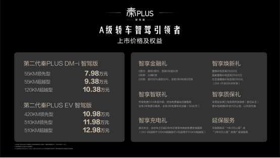 凤凰网科技讯 2月11日,比亚迪昨晚正式推出第二代秦PLUS智驾版,新车涵盖插电混动(DM-i)与纯电(EV)双动力版本,共发布6款配置车型。其中DM-i版售价7.98万-10.38万元,EV版售价10.98万-12.98万元,以四大核心升级重新定义A级轿车智能化标准。 本次换代最大亮点在于智能驾驶系统的跨越式升级。除入门款外,其余5款车型均搭载天神之眼C高阶智驾三目版(DiPilot 100),采用5R12V多传感器融合方案,配备包括12颗超声波雷达、5颗毫米波雷达在内的29个高精度传感器,实现L2+级辅助驾驶能力。 高快领航系统可完成高速场景下1000公里级自动驾驶接管,支持自主上下匝道、智能避障和大曲率弯道通行。针对狭窄车位场景,全场景智能泊车系统新增手机遥控功能,支持用户离车状态下的自动泊入泊出。值得关注的是,这是比亚迪首次将高阶智驾系统下探至9万元价格区间。 插混版车型搭载全新第五代DM混动系统,NEDC工况下百公里亏电油耗降至2.93L,综合续航达2055km,相较前代产品节能效率提升约7%。纯电版本基于e平台3.0打造,采用八合一电驱总成与宽温域热泵系统,低温续航达成率提升15%,官方数据显示其冬季续航衰减可控制在同级最低水平。 座舱系统升级至DiLink 100平台,配备12.8英寸自适应旋转中控屏,新增双桌面自由切换、3D车辆控制及哨兵模式等功能。物理操作区域经过重新设计,采用磨砂材质面板与“锁子纹”装饰,保留实体空调按键的同时优化触控体验。 新车延续王朝系列设计语言,前脸采用龙吟阔境格栅,尾部配备中国结贯穿式尾灯。车身尺寸维持现款标准,轴距2718mm,后排座椅支持4/6比例放倒。内饰采用环抱式对称布局,新增冰川蓝配色方案。 作为比亚迪冲击年度销冠的战略车型,秦PLUS智驾版的定价策略显示出企业对A级轿车市场的精准把控。据乘联会数据显示,2023年秦家族累计销量突破45万辆,占据细分市场23.6%份额。此次智驾系统的下放,或将加速15万元以下车型的智能化军备竞赛。业内人士指出,随着新能源汽车渗透率突破35%,智能化配置正逐步取代单纯续航参数,成为消费者核心购车考量因素。 (责任编辑:王治强 HF013)
