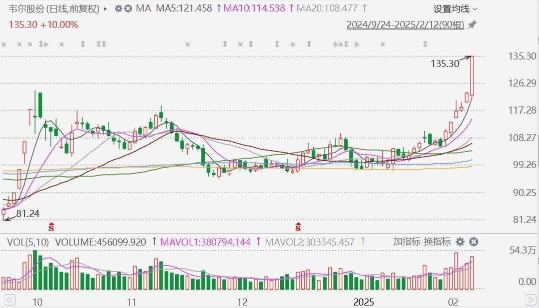 格隆汇2月12日|韦尔股份(603501)(603501.SH)涨停,报价135.3元,股价创2022年4月以来新高,总市值达1645亿元。