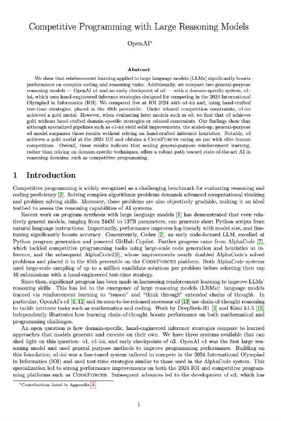 仟茂科技讯 2月12日晚间消息,在中国AI公司的影响下,OpenAI 公开了O系列强化学习的秘密。今天(2月12日),OpenAI发布了关于推理模型在竞技编程中应用的研究论文报告《Competitive Programming with Large Reasoning Models》,文中放出了OpenAI三个推理模型:o1、o1-ioi、o3在IOI(国际信息学奥林匹克竞赛)和CodeForces(全球知名在线编程竞赛)中的成绩。 论文显示,在IOI 2024中,o3在严格规则下拿到395.64分,达成金牌成就,并且在CodeForces上的表现与人类精英选手相当。论文中特别提到,中国的DeepSeek-R1和Kimi k1.5通过独立研究显示,利用思维链学习(COT)方法,可显著提升模型在数学解题与编程挑战中的综合表现。R1、k1.5是DeepSeek和Kimi在1月20日同时发布的新型推理模型。 该论文通过强化学习(RL)训练的大型语言模型在复杂编码和推理任务上的性能提升,比较了通用推理模型与针对特定领域优化的系统在竞技编程中的表现。研究结果表明,增加强化学习训练计算和测试时计算可显著提升模型性能,使其接近世界顶尖人类选手,这些模型将在科学、编码、数学等领域的AI应用中解锁新的应用体验。(文猛) 责任编辑:王若云 (责任编辑:郭健东 )