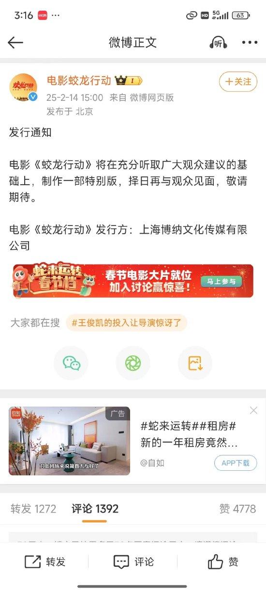 今日,电影《蛟龙行动》官博发文称,将在充分听取广大观众建议的基础上,制作一部特别版,择日再与观众见面,敬请期待。