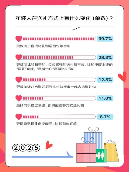 情人节消费市场火热,礼赠经济受关注,“送礼”功能带来电商销量小高峰。 春节假期与元宵佳节刚过,2月14日情人节就接踵而至,也让消费市场再次迎来一波热潮。 从多家电商和零售平台公布的数据来看,相比往年,今年情人节消费市场更加多元化。除了传统的鲜花、巧克力、首饰珠宝外,浪漫主题的服饰穿搭、人工培育钻石等在今年成为新宠。此外,线上送礼物功能也愈发受到年轻消费者的关注。 具体来看,情人节前,鲜花需求大幅增加,新中式主题鲜花成为新宠。美团平台数据显示,2月以来,“情人节鲜花”关键词搜索量同比增长50%;新中式主题尤其热门,春节后一周,“新中式鲜花”关键词搜索量同比增长超4倍。 记者在美团等平台发现,不少花店上线了富含文博等元素的新中式花束。美团方面透露,近期推出颐和园联名款等多款新中式花束,将古典文化元素融入花束设计中,顺应“新中式热”鲜花消费趋势拓展市场。 从京东超市的数据来看,巧克力和鲜花保持高速增长。截至目前,巧克力的销售相比去年增长超过115%,牛奶巧克力和夹心巧克力增速高于200%。形状为“心形”的巧克力商品种类不仅比去年有所增加,而且销量也增加了6倍。鲜花方面,玫瑰仍然是今年情人节的销售担当。截至2月11日,京东超市已经卖出玫瑰花超1亿枝,比去年增长5倍多。 值得一提的是,人工培育的钻石在线上销售火爆,成为情人节礼物新宠。京东平台上,今年情人节前人工培育钻石类销售增长超3倍。 同样,服饰、美妆、传统珠宝等礼赠品类的关注度也持续走高。特卖电商唯品会数据显示,近一周以来,以情人节礼赠为主题的商品销量同比翻倍,其中,护肤套装销量同比增长201%,口红销量翻倍,黄金吊坠销量同比增长96%。此外,女生向男生的礼赠消费也在攀升,数据显示,皮带销量同比增长2倍以上。 除此之外,被电商平台寄予厚望的“送礼”功能关注度也快速增长。京东最新调研显示,60.5%的消费者已经关注到或使用过线上送礼功能。通过线上送礼功能为Ta送上甜蜜礼物成为送礼新方式。近三成年轻人更倾向体验新奇的、仪式感强的送礼方式,比如电商上线的“送礼”功能。 唯品会相关负责人对记者表示,唯品会是首批接入微信送礼的电商平台,情人节前,“送礼”带来的销量出现了一个小高峰。从品类上看,大牌美妆、轻奢包包等高品质商品是消费者送礼的主要选择。微信送礼关注度的持续提升,侧面折射出社交及电商平台创新对于消费的推动作用。 事实上,不仅是情人节,礼赠在消费市场中的份额也在逐渐扩大。艾媒咨询数据显示,2018―2023年中国礼物经济产业市场规模从8000亿元增至12998亿元,呈逐年递增趋势,2024年有望达13777亿元。预计2027年将达16197亿元。2023年中国礼物经济用户人均年送礼次数4.9次,人均年送礼金额2340.4元。礼赠对于消费的驱动力正在提升成为共识。 情人节也催生餐饮堂食消费火热。以火锅龙头海底捞为例,记者获悉,海底捞数据显示,截至2月13日中午,全国海底捞火锅已接到2月14日的用餐预订约7万桌,显著高于平日周五的预订量,彰显出节日消费的强劲拉动效应。 海底捞相关负责人表示,今年情人节不仅是“情侣专属”,也是年轻人社交聚会的契机。相较于往年情人节,今年不但小桌预订需求旺盛,大桌和包间的预订需求也显著被带动。随着春节后大学生陆续返校、年轻白领返回工作地,许多年轻人借情人节相约海底捞,举行“年后第一聚”。 今年情人节正值周五,也让周边度假游再次迎来小高峰。途牛截至目前最新预订数据显示,“情人节+周末”的组合下,超75%的途牛用户选择了1―3天的短途周边游。主题乐园成为“浪漫据点”,途牛“广州长隆和珠海长隆酒景套餐”“上海迪士尼2―4日套餐”等主题乐园相关产品预订热度攀升。 情人节及当周周末团期打包旅游产品预订中,跟团游出游人次占比超过50%。其中,“张家界森林公园―天门山―凤凰古城5日游”“福州三坊七巷―平潭海岛风光4日游”“九寨沟―黄龙―熊猫乐园3日游”“三亚―蜈支洲―天堂―南山5日游”“丽江―香格里拉―大理―泸沽湖8日游”等小团游、纯玩团、私家团产品预订火爆。 酒店预订方面,华住集团数据显示,2月14日(情人节)酒店整体预订率比2月13日预订率增加了6个百分点。预订率TOP5的省市有黑龙江省、北京市、广东省、云南省、上海市。