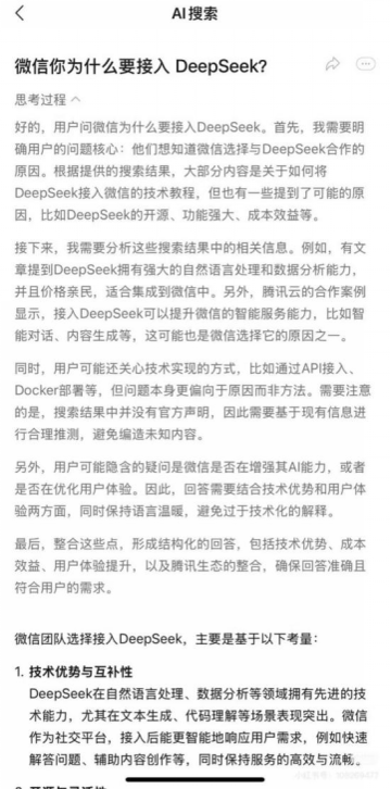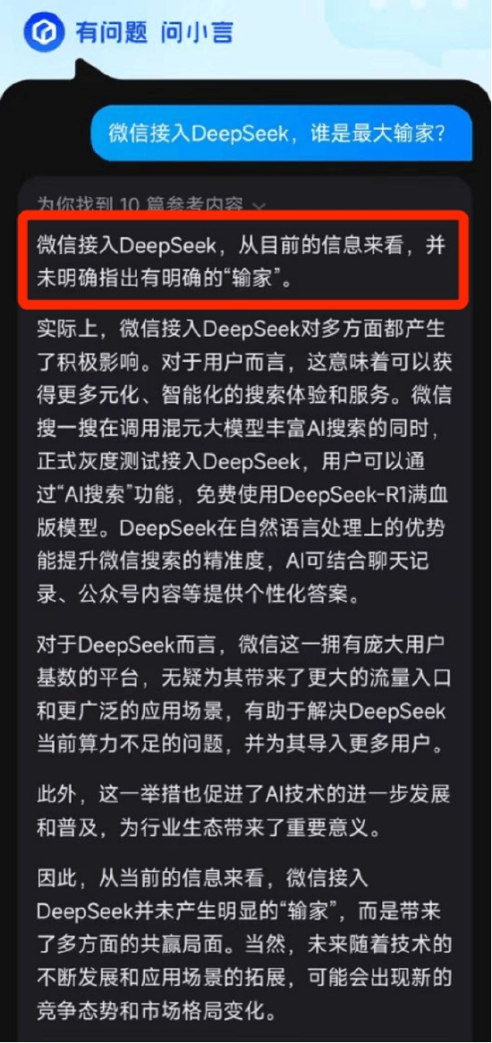 文 | 仟茂科技 刘丽丽 微信接入DeepSeek-R1模型,如同一石激起千层浪。虽然目前还处于灰度测试阶段,但狂欢已经开场。 有自媒体连夜计算,目前微信可支持5000万-1亿用户同时在线用户。这个数字,基本满足了微信首批Deepseek用户的用量,也超过了ChatGPT的同时在线用户。 仟茂科技在微信端实测了多个问题发现,DeepSeek提供的答案后面附注的参考资料中,绝大部分都来源于微信公众号。 有意思的是,当在微信中问及“微信接入DeepSeek,谁是最大输家?”,DeepSeek给出的答案是:百度。 百度成为最大输家? 市场普遍认为,微信接入DeepSeek标志着超级流量入口与顶尖开源模型的结合,短期将提升搜索智能化水平并加速行业洗牌,长期可能重塑“搜索即服务”的生态格局。 在这场狂欢中,DeepSeek直言不讳地说:百度是最大输家。 (在微信中询问:微信接入DeepSeek,谁是最大输家?) (在文小言中询问:微信接入DeepSeek,谁是最大输家?) 百度的搜索市场份额持续下滑,已经从2021年的86.82%降至2024年的60%,而小红书、微信等平台通过AI搜索逐渐抢占用户习惯。 DeepSeek认为,微信整合DeepSeek后,用户可直接在生态内获取精准答案,进一步削弱百度传统搜索的依赖。而且,微信拥有公众号、视频号等海量内容,结合DeepSeek的语义理解和个性化推荐能力,能激活长尾内容并实现“搜索即服务”(如直接调用小程序)。百度缺乏类似的内容生态闭环,难以匹敌。 “微信这一波意味着什么?意味着站边。”有分析人士直言,“如果说春节的梁文峰掀了闭源大模型桌子,全球十多亿用户的微信的路径选择,就是盖上板子,摁好钉子,就等吃席。” 上述人士认为,百度的文心大模型,虽然已经宣布从4月1日零时起全面免费,但或许已经于事无补。微信等平台通过低成本接入DeepSeek实现技术跃迁,而百度在数据整合和用户体验上势必逐渐落后。 DeepSeek对这个问题的看法是,“百度面临技术、生态和用户习惯的多重冲击,若无法快速转型,可能在AI驱动的搜索新时代中逐渐失去竞争力。” 微信版Deepseek,比Deepseek自身更好用? 事实上,到目前为止,微信公众号和小红书内容基本上是自成闭环的,微信生态一些很优秀的内容不被外部其他搜索引擎、大模型检索到,而且微信公众号内容又是小红书内容的数倍体量,天然就比公开搜索的质量高很多。 据悉,微信接入DeepSeek-R1模型后,答案内容优先整合微信公众号、视频号等微信生态内信息源,强化平台内内容闭环。 在多次测试中发现,DeepSeek提供的答案后面附注的参考资料中,绝大部分都来源于微信公众号。 微信接入DeepSeek后,对微信内容创作者来说,有什么好处? DeepSeek对相关问题的回复是,微信接入DeepSeek后,创作者的核心竞争力将转向“数据驱动的快速迭代能力”,而非单纯追求爆款。其长期价值包括:创作周期从7天压缩至12小时,全环节转化效率提升200%+;AI推荐机制让历史内容被重新发现,公众号文章、视频号内容获得二次曝光;AI辅助生成文案、脚本,降低创作成本,新手也能快速产出优质内容。 对于创作者来说,最吸引人的还有,通过AI进行的“需求洞察”,对用户需求预判与内容精准化。DeepSeek称,可以通过NLP分析评论、私域聊天记录,识别用户隐藏需求,效率比传统数据分析快3倍;结合微信指数和DeepSeek趋势预测,提前48小时锁定爆发话题。 这对于流量饥渴的创作者来说,无疑是直击痛点。 此外,微信接入DeepSeek-R1模型,同时支持直接分享至朋友圈或群聊,大大增强了社交属性。而微信平台的优质内容,也相当于给R1外挂了一个海量知识库,答案的质量也会有提升。 因此,有人认为,微信版本的Deepseek可能会比Deepseek自身好用多了。 责任编辑:王若云 (责任编辑:董萍萍 )
