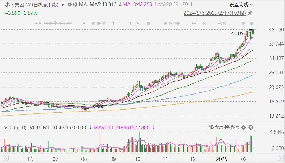 2月17日消息,港股三大指数集体跳水,截至发稿,恒指跌0.1%,恒生科指跌0.15%,国企指数跌0.22%。 盘初再度创出历史新高价45.05港元的小米集团-W(1810.HK)随后逆势下跌,一度跌2.5%至43.55港元。持续创新高的小米集团遭南下资金减仓。截至上周五,南下资金已连续4日净卖出小米,共计39.8758亿港元。 (责任编辑:宋政 HN002)