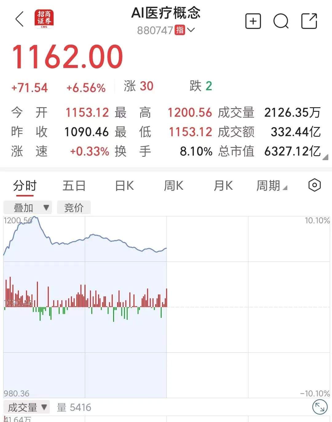 2月17日上午,A股市场科技类股票继续领跑市场,带动多数股票走强。AI医疗板块大涨,成为上午盘中最大亮点之一,该板块盘中涨幅一度超过7%。 典型个股方面,光线传媒(300251)开盘就快速上行,1分钟冲到涨停,但随后立马开板,股价快速跳水并翻绿,跌幅又一度高达19.84%,5分钟内近乎上演“天地板”,振幅达39.85%,成交额已经接近150亿元。 港股市场整体进一步上行,恒生指数盘中涨幅超过1%。 AI医疗板块爆发 2月17日上午,A股市场科技类股票继续领跑市场,带动多数股票走强。截至中午收盘,上证指数上涨0.06%,深证成指上涨0.41%,创业板指上涨0.61%,北证50指数上涨1.63%。 具体行业板块和赛道方面,电信运营板块大涨,板块盘中涨幅超过3%,中国联通(600050)A股盘中涨幅超过8%,进一步创出今年以来新高;中国电信盘中涨幅接近7%,股价再度创出历史新高。 文教休闲、综合类、软件服务、IT设备等板块涨幅居前。有色、煤炭、传媒娱乐等板块跌幅居前。 概念板块方面,AI医疗板块大涨,成为上午盘中最大亮点之一,该板块盘中涨幅一度超过7%,安必平盘中“20cm”涨停,泓博医药、迪安诊断(300244)、思创医惠(300078)、祥生医疗、超研股份等多股盘中涨幅超过10%,美年健康(002044)、贝瑞基因(000710)等盘中涨停。 教育板块整体上扬,佳发教育(300559)盘中一度“20cm”涨停,豆神教育盘中涨逾10%,昂立教育(600661)、全通教育(300359)盘中亦均一度涨停。 光线传媒股价放量巨震 盘中近乎“天地板” 在此前连续暴涨后,光线传媒今天上午股价剧烈波动。光线传媒今日一开盘就快速上行,1分钟冲到涨停,但随后立马开板,股价快速跳水并翻绿,跌幅又一度达到19.84%,5分钟内近乎上演“天地板”,振幅达39.85%,成交额接近150亿元。 据灯塔专业版数据,截至发稿,《哪吒之魔童闹海》累计票房已超过119亿元。 在光线传媒股价巨震之际,多只传媒娱乐个股也开始大跌,其中,华策影视(300133)盘中跌幅一度超过11%,万达电影(002739)盘中跌幅超过8%。 万达电影昨晚发布公告称,万达电影持股5%以上股东莘县融智兴业管理咨询中心(有限合伙)(以下简称“莘县融智”)计划在公告披露之日起15个交易日后的3个月内通过集中竞价及大宗交易方式减持公司股份累计不超过6335.34万股,即不超过公司总股本的3.0000%。 公告称,截至公告披露日,莘县融智持有公司股份1.55亿股,占公司总股本的7.3325%,莘县融智及其一致行动人合计持有公司股份1.699亿股,占公司总股本的8.0456%。 根据减持计划,减持原因为莘县融智自身资金需求,减持股份来源为通过协议转让和发行股份购买资产取得的公司股份。 DeepSeek概念整体继续走强 DeepSeek概念整体继续走强。DeepSeek概念指数成份股中,美年健康、云赛智联(600602)、数据港(603881)等多股涨停。 数据港上周五晚间发布公告称,数据港主营业务涵盖IDC业务、IDC解决方案业务以及云服务销售业务,其中IDC业务主要为数据中心服务器托管业务。公司不存在大模型、DeepSeek相关产品,也不存在DeepSeek、大模型相关股权合作与其他业务合作。 重大事项情况方面,数据港称,经公司自查,并向公司控股股东上海市北高新(600604)(集团)有限公司书面征询核实。截至目前,控股股东及实际控制人均不存在涉及公司应披露而未披露的重大影响股价敏感信息,包括但不限于:重大资产重组、股份发行、重大交易类事项、业务重组、股份回购、股权激励、破产重整、重大业务合作、引进战略投资者等重大事项。 美年健康昨晚发布公告称,公司董事会确认,公司目前没有任何根据《深圳证券交易所股票上市规则》等有关规定应予以披露而未披露的事项或与该事项有关的筹划、商谈、意向、协议等;董事会也未获悉公司有根据《深圳证券交易所股票上市规则》等有关规定应予以披露而未披露的、对公司股票及其衍生品种交易价格产生较大影响的信息;公司前期披露的信息不存在需要更正、补充之处。公司请广大投资者理性投资,注意风险。 港股整体进一步上行 有个股盘中“闪崩” 港股市场整体进一步上行,恒生指数盘中涨幅超过1%。恒生指数成份股中,腾讯控股、中芯国际等涨幅居前,百度集团-SW、比亚迪(002594)电子、紫金矿业(601899)等跌幅居前。 港股市场大幅波动的港股中,迈富时盘中“闪崩”,截至发稿,该股跌超37%。 本文首发于微信公众号:证券时报。文章内容属作者个人观点,不代表和讯网立场。投资者据此操作,风险请自担。 (责任编辑:宋政 HN002)