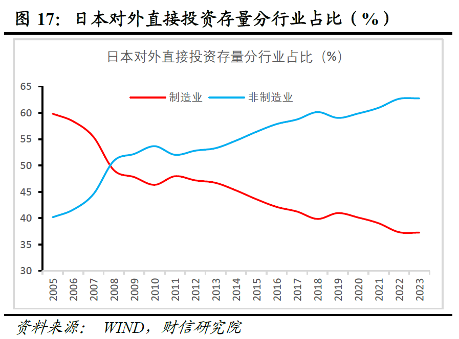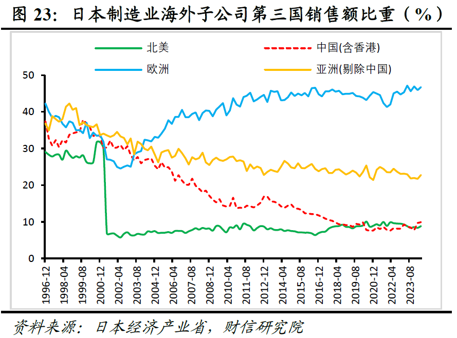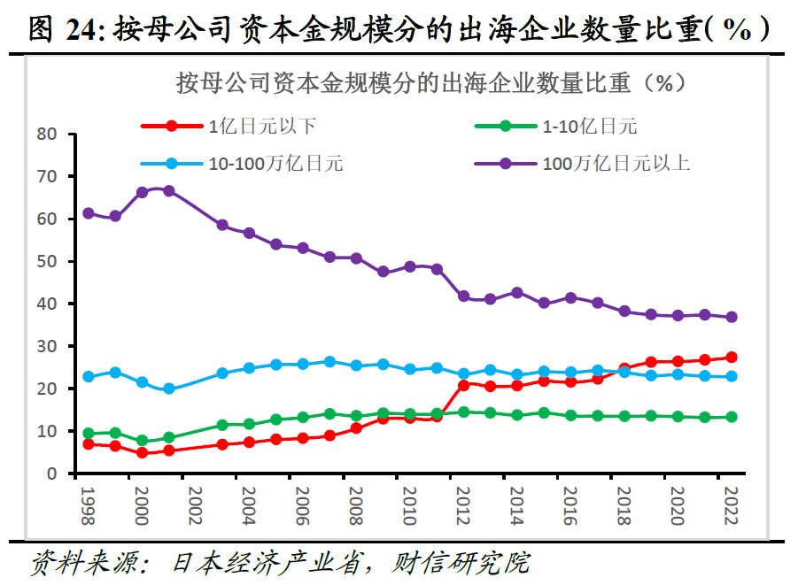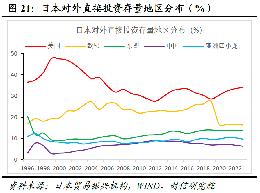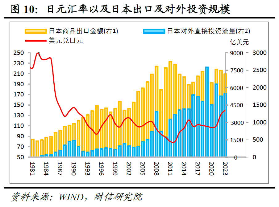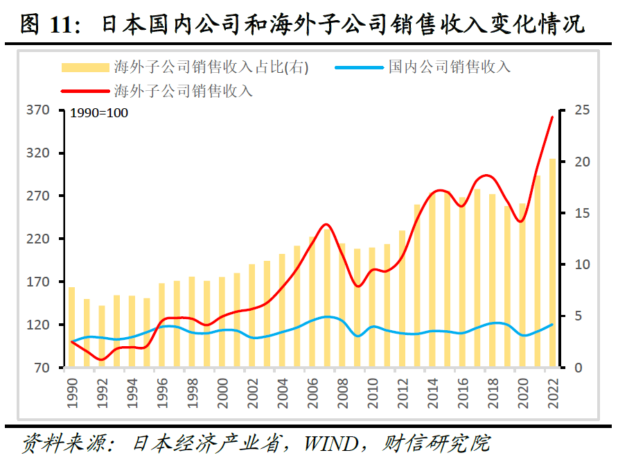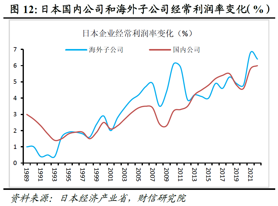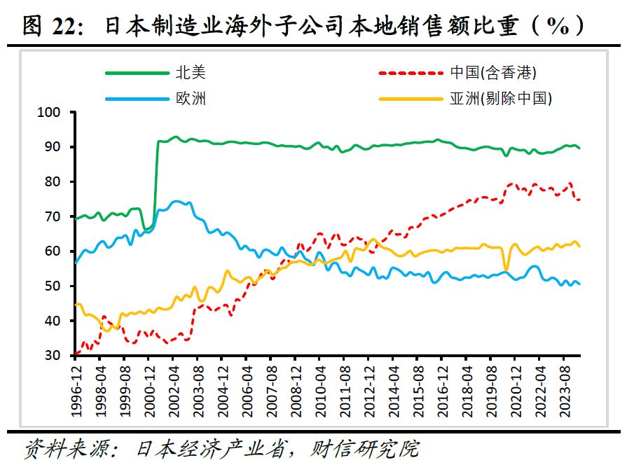 日本出海的经验和启示 ――全球产业链研究(一) 全文共6550字,阅读大约需要13分钟 文 财信研究院 宏观团队 伍超明 李沫 核心观点 特朗普2.0时代的关税威胁,加剧了逆全球化趋势以及对新一轮“贸易战”的担忧。与此同时,全球经济格局正在发生深刻变化,国内企业也正从“产品国际化”迈向“资本国际化”。在此背景下,出海或许将成为中国企业不得不考虑的重要应对策略。自1990年代以来,日本企业在“失去的二十年”中积极出海,成为其发展过程中的一抹亮色,为中国企业出海提供了宝贵的经验借鉴。 一、日本企业出海原因:外部贸易摩擦升级和内部供需失衡加剧。从外部看,1990年前后日本名义GDP与美国的比值一度攀升至超七成,加上同期日本贡献了美国全部贸易逆差的5成左右,美日贸易摩擦持续升级,倒逼日本企业出海以规避贸易壁垒。从内部看,内需疲弱、成本上升、产能过剩问题的叠加并存,是日本企业主动出海的内在动因:一方面,“泡沫经济”破裂导致日本私人部门资产负债表收缩,内需陷入长期低迷;另一方面,人口老龄化不仅加剧了内需不足,还减少了劳动力供给,进而推升了企业的成本压力;此外,需求疲弱也催生了日本的产能过剩问题。 二、日本企业出海影响:稳定汇率、保障国民收入、推动产业升级。一是企业出海推动日本由贸易顺差转变为投资顺差,但经常账户差额整体稳中有升,对日元稳定和日元资产的国际竞争力形成有力支撑。二是出海带动日本企业收入和利润率双提升,部分冲销了国内需求疲弱对就业和国民收入的拖累。三是海外市场的拓展推动日本企业增加研发投入,助力国内产业结构升级。 三、日本企业出海的五点经验和启示。第一,日本出海呈现两大特征,一是早期依据出口产品国际竞争优势布局,投资集中于运输设备等制造业;二是随着出海成效显现与全球需求结构调整,产业从制造业向非制造业过渡,产业结构向微笑曲线两端延伸。第二,出海目的地因投资动机不同而改变:早期为规避贸易摩擦和占全球市场份额倾向美国,后因劳动力成本因素转向亚洲,近年来又因科技革命和逆全球化浪潮加大对美欧投资。第三,企业需根据不同目标市场灵活调整产销策略,如在美国主要采取本土化策略,欧洲由本土化策略逐步转向外销,中国则由外销为主转向本土化策略。第四,日本企业出海投资呈“大企业开路、中小企业跟进”的梯队演进格局。第五,对出海企业的全方位政策支持,对企业成功出海起到了关键作用。 正文 特朗普2.0时代的关税威胁,加剧了逆全球化趋势以及对新一轮“贸易战”的担忧。与此同时,全球经济格局正在发生深刻变化,国内企业也正从“产品国际化”迈向“资本国际化”。在此背景下,出海或许将成为中国企业不得不考虑的重要应对策略。自1990年代以来,日本企业在“失去的二十年”中积极出海,成为其发展过程中的一抹亮色,为中国企业出海提供了宝贵的经验借鉴。作为企业出海研究系列的开篇之作,本文将重点分析日本企业出海的原因、影响以及对中国的启示。 一、日本企业出海原因:外部贸易摩擦升级+内部供需失衡加剧 (一)外部与美贸易摩擦升级,倒逼日本企业出海 1960-1990年期间,日本经济快速追赶美国,其名义GDP占美国名义GDP的比值由不足1成快速升至7成左右(见图1)。同期日本对美国贸易逆差的贡献也不断上升(见图2),导致美日贸易摩擦不断升级。摩擦对象经历了“纺织、钢铁等低附加值产业→汽车、家电等代表的技术密集型行业→汇率、经济结构等领域”的演变,日本的应对措施也跟随调整,由最开始的“实行自愿出口管制”、“设定最低出口价格”等限制性措施,到逐步尝试鼓励企业海外投资建厂(见表1),最终实现了“贸易立国”到“对外投资立国”的转变,成功规避了贸易壁垒。 (二)内部“需求下降、成本上升、产能过剩”并存,日企选择主动出海 一是“泡沫经济”破裂导致私人部门资产负债表收缩,日本国内需求持续下台阶。1990年前后,日本虚拟经济的两大代表指数―日经225指数和日本城市住宅土地价格指数双双从高点回落,累计最大降幅分别近80%和超50%(见图3)。两大资产价格下跌,使得此前的财富效应和抵押效应逆转,居民和企业部门资产增长陷入停滞甚至缩水。经济遭受重创,安全资产匮乏,两大部门纷纷转向负债最小化,即通过停止借贷或偿还债务的方式修复资产负债表,进而导致私人部门消费和投资行为陷入低迷,对日本国内需求形成持续拖累(见图4)。 二是人口老龄化加剧日本内需不足并推升企业成本压力。根据世界银行数据,1990前后日本正处于由轻度老龄化社会步入中度老龄化社会的关键时期,此后老龄化速度明显加快。如日本从中度老龄化社会过渡到重度老龄化社会(老龄化率14%→21%)仅用了12年,而此期从轻度老龄化过渡到中度老龄化社会(老龄化率7%→14%)用了25年(见图5)。老龄化率的迅速提升,对日本经济供需两端均产生深远影响:首先,增加了养老负担,降低了全社会的消费意愿和财政逆周期能力,从而对中长期需求形成明显抑制。其次,老龄化导致劳动力市场结构发生深刻变化,如日本的劳动参与率从1991年的63.8%持续下降至2012年的59.1%(见图5)。劳动力供给减少导致日本企业劳动力成本大幅上升,如日本企业单位劳动力成本自70年代以来持续攀升,至90年代达到历史最高值(