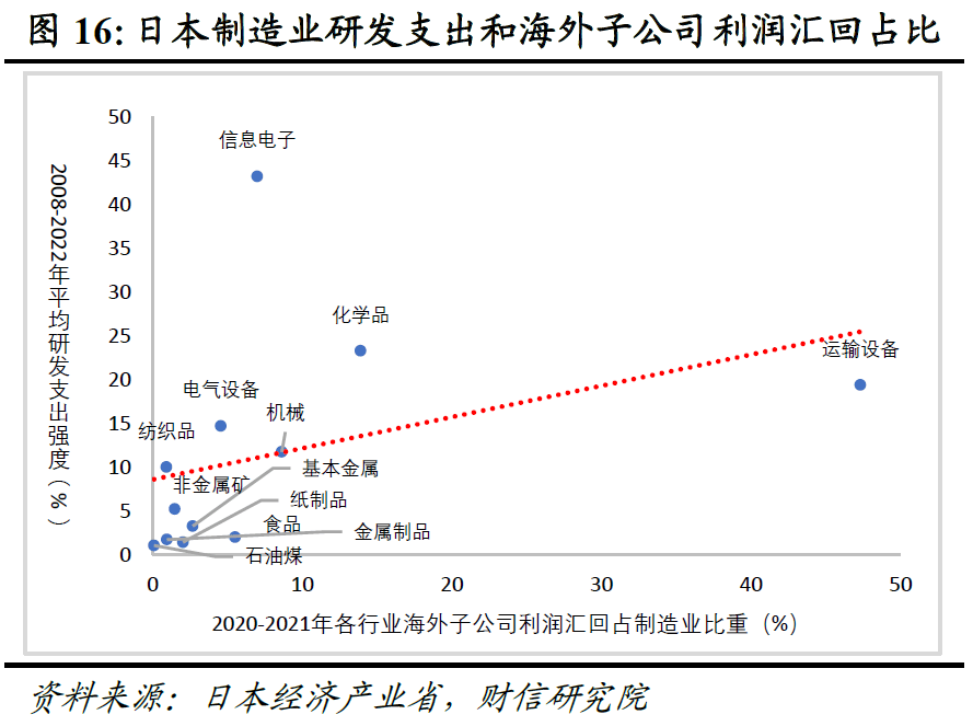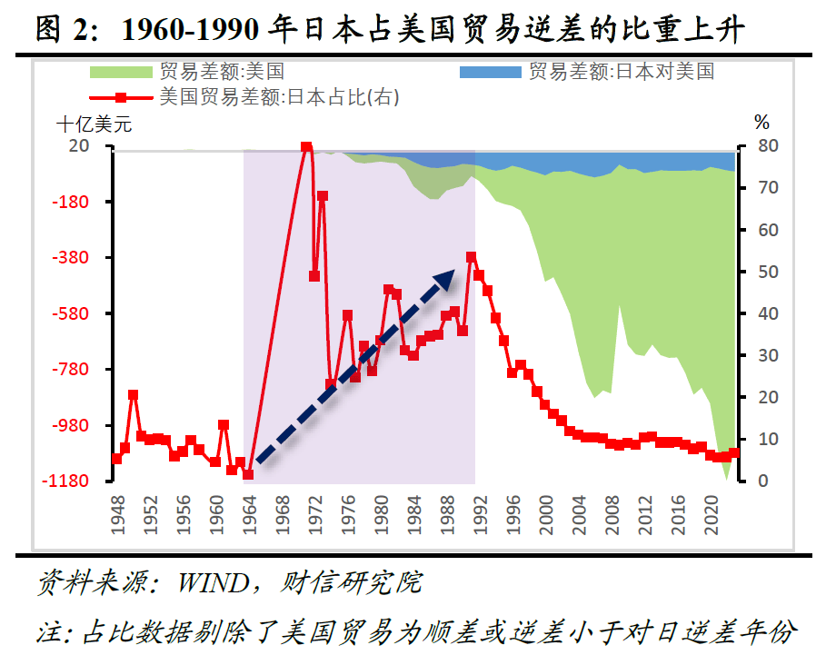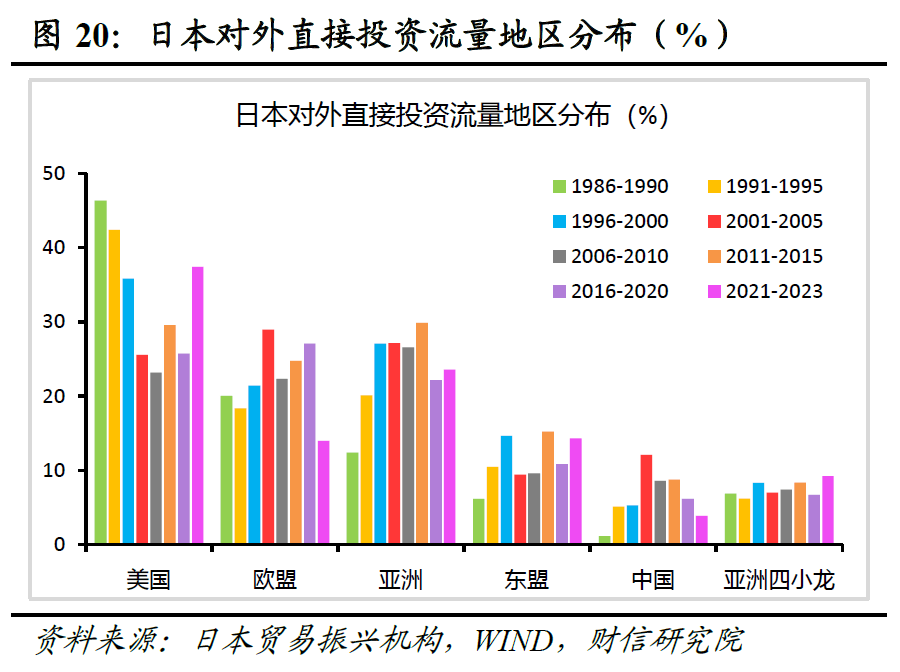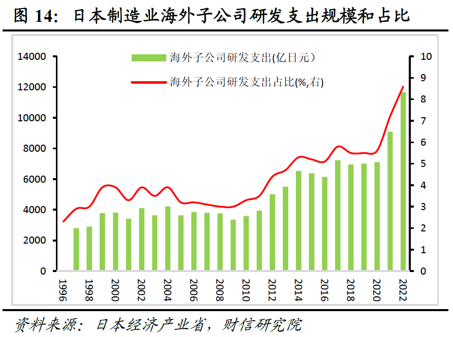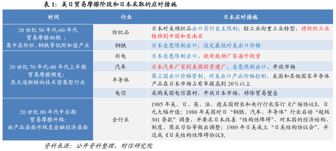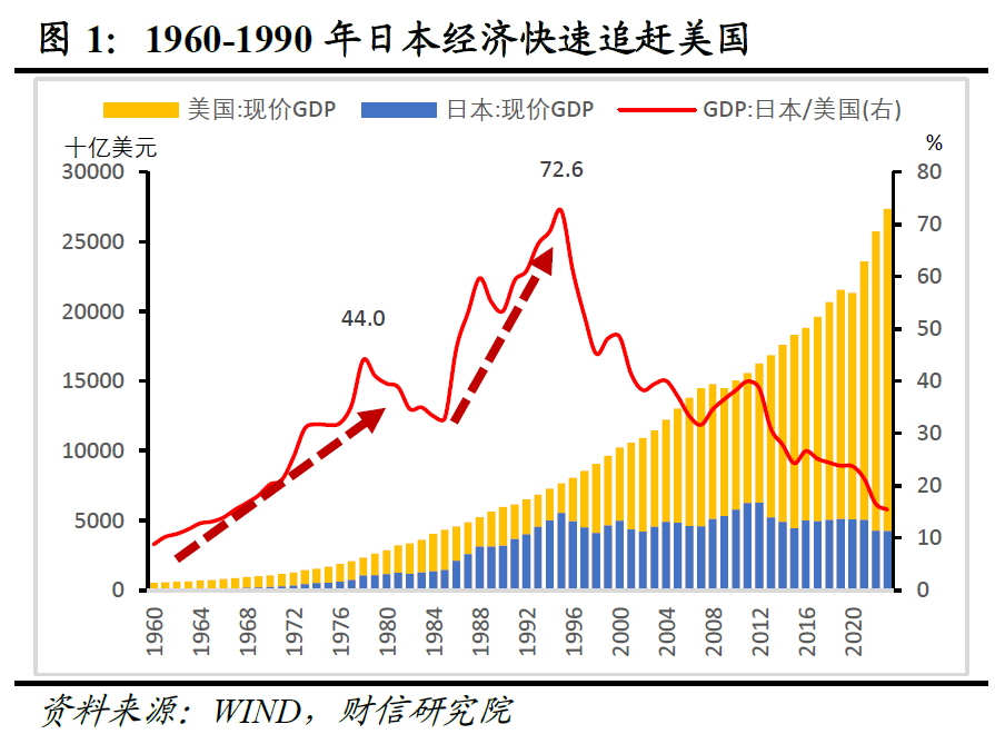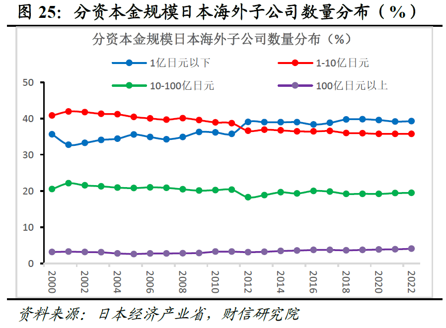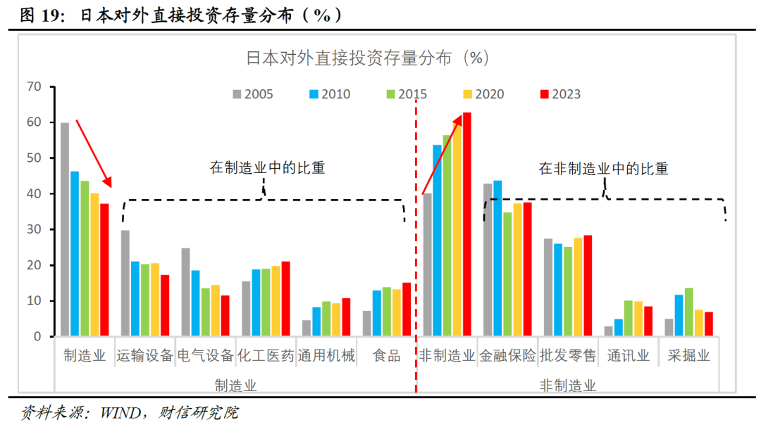 日本出海的经验和启示 ――全球产业链研究(一) 全文共6550字,阅读大约需要13分钟 文 财信研究院 宏观团队 伍超明 李沫 核心观点 特朗普2.0时代的关税威胁,加剧了逆全球化趋势以及对新一轮“贸易战”的担忧。与此同时,全球经济格局正在发生深刻变化,国内企业也正从“产品国际化”迈向“资本国际化”。在此背景下,出海或许将成为中国企业不得不考虑的重要应对策略。自1990年代以来,日本企业在“失去的二十年”中积极出海,成为其发展过程中的一抹亮色,为中国企业出海提供了宝贵的经验借鉴。 一、日本企业出海原因:外部贸易摩擦升级和内部供需失衡加剧。从外部看,1990年前后日本名义GDP与美国的比值一度攀升至超七成,加上同期日本贡献了美国全部贸易逆差的5成左右,美日贸易摩擦持续升级,倒逼日本企业出海以规避贸易壁垒。从内部看,内需疲弱、成本上升、产能过剩问题的叠加并存,是日本企业主动出海的内在动因:一方面,“泡沫经济”破裂导致日本私人部门资产负债表收缩,内需陷入长期低迷;另一方面,人口老龄化不仅加剧了内需不足,还减少了劳动力供给,进而推升了企业的成本压力;此外,需求疲弱也催生了日本的产能过剩问题。 二、日本企业出海影响:稳定汇率、保障国民收入、推动产业升级。一是企业出海推动日本由贸易顺差转变为投资顺差,但经常账户差额整体稳中有升,对日元稳定和日元资产的国际竞争力形成有力支撑。二是出海带动日本企业收入和利润率双提升,部分冲销了国内需求疲弱对就业和国民收入的拖累。三是海外市场的拓展推动日本企业增加研发投入,助力国内产业结构升级。 三、日本企业出海的五点经验和启示。第一,日本出海呈现两大特征,一是早期依据出口产品国际竞争优势布局,投资集中于运输设备等制造业;二是随着出海成效显现与全球需求结构调整,产业从制造业向非制造业过渡,产业结构向微笑曲线两端延伸。第二,出海目的地因投资动机不同而改变:早期为规避贸易摩擦和占全球市场份额倾向美国,后因劳动力成本因素转向亚洲,近年来又因科技革命和逆全球化浪潮加大对美欧投资。第三,企业需根据不同目标市场灵活调整产销策略,如在美国主要采取本土化策略,欧洲由本土化策略逐步转向外销,中国则由外销为主转向本土化策略。第四,日本企业出海投资呈“大企业开路、中小企业跟进”的梯队演进格局。第五,对出海企业的全方位政策支持,对企业成功出海起到了关键作用。 正文 特朗普2.0时代的关税威胁,加剧了逆全球化趋势以及对新一轮“贸易战”的担忧。与此同时,全球经济格局正在发生深刻变化,国内企业也正从“产品国际化”迈向“资本国际化”。在此背景下,出海或许将成为中国企业不得不考虑的重要应对策略。自1990年代以来,日本企业在“失去的二十年”中积极出海,成为其发展过程中的一抹亮色,为中国企业出海提供了宝贵的经验借鉴。作为企业出海研究系列的开篇之作,本文将重点分析日本企业出海的原因、影响以及对中国的启示。 一、日本企业出海原因:外部贸易摩擦升级+内部供需失衡加剧 (一)外部与美贸易摩擦升级,倒逼日本企业出海 1960-1990年期间,日本经济快速追赶美国,其名义GDP占美国名义GDP的比值由不足1成快速升至7成左右(见图1)。同期日本对美国贸易逆差的贡献也不断上升(见图2),导致美日贸易摩擦不断升级。摩擦对象经历了“纺织、钢铁等低附加值产业→汽车、家电等代表的技术密集型行业→汇率、经济结构等领域”的演变,日本的应对措施也跟随调整,由最开始的“实行自愿出口管制”、“设定最低出口价格”等限制性措施,到逐步尝试鼓励企业海外投资建厂(见表1),最终实现了“贸易立国”到“对外投资立国”的转变,成功规避了贸易壁垒。 (二)内部“需求下降、成本上升、产能过剩”并存,日企选择主动出海 一是“泡沫经济”破裂导致私人部门资产负债表收缩,日本国内需求持续下台阶。1990年前后,日本虚拟经济的两大代表指数―日经225指数和日本城市住宅土地价格指数双双从高点回落,累计最大降幅分别近80%和超50%(见图3)。两大资产价格下跌,使得此前的财富效应和抵押效应逆转,居民和企业部门资产增长陷入停滞甚至缩水。经济遭受重创,安全资产匮乏,两大部门纷纷转向负债最小化,即通过停止借贷或偿还债务的方式修复资产负债表,进而导致私人部门消费和投资行为陷入低迷,对日本国内需求形成持续拖累(见图4)。 二是人口老龄化加剧日本内需不足并推升企业成本压力。根据世界银行数据,1990前后日本正处于由轻度老龄化社会步入中度老龄化社会的关键时期,此后老龄化速度明显加快。如日本从中度老龄化社会过渡到重度老龄化社会(老龄化率14%→21%)仅用了12年,而此期从轻度老龄化过渡到中度老龄化社会(老龄化率7%→14%)用了25年(见图5)。老龄化率的迅速提升,对日本经济供需两端均产生深远影响:首先,增加了养老负担,降低了全社会的消费意愿和财政逆周期能力,从而对中长期需求形成明显抑制。其次,老龄化导致劳动力市场结构发生深刻变化,如日本的劳动参与率从1991年的63.8%持续下降至2012年的59.1%(见图5)。劳动力供给减少导致日本企业劳动力成本大幅上升,如日本企业单位劳动力成本自70年代以来持续攀升,至90年代达到历史最高值(
