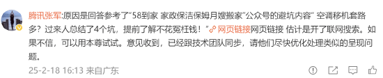 仟茂科技讯 2月18日下午消息,近日,有网友发现腾讯元宝接入的Deepseek R1居然在回答中植入广告!并直呼:“AI的答案一旦被广告侵染就几乎没有价值了”。 对此,腾讯张军在其评论区回应称:“理论上不应该,已经让技术去查了。” 随后,张军表示:“原因是回答参考了‘58到家 家政保洁保姆月嫂搬家’公众号的避坑内容, 估计是开了联网搜索。”(罗宁) (责任编辑:宋政 HN002)