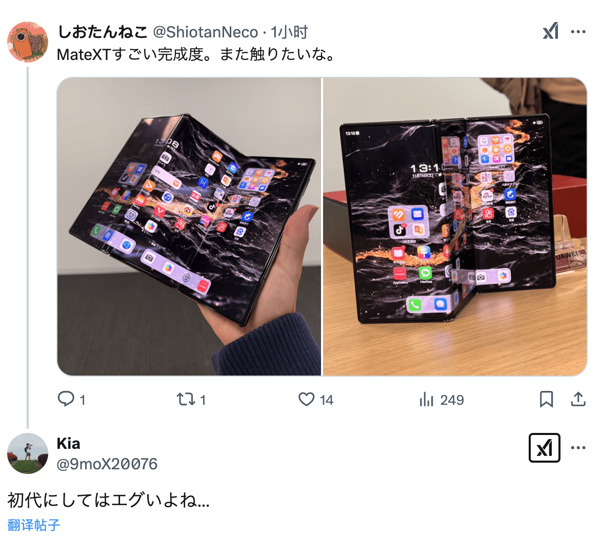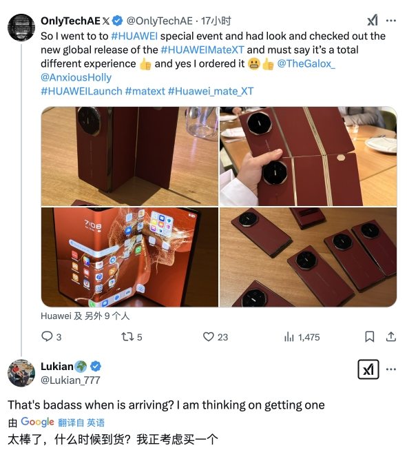 Mate XT 凤凰网科技讯 北京时间2月18日,据CNBC报道,华为公司周二面向中国以外市场推出了三折叠智能手机Mate XT,重新进军国际市场。 Mate XT在海外市场的起售价为3499欧元(约合2.7万元人民币),相比之下国行版起售价为1.9999万元。华为尚未宣布该手机将在哪些国家上市,但已告知用户留意当地的公告。 不过,X上的信息显示,Mate XT将在马来西亚上市,Mate XT Ultimate Edition(16GB+1TB)版机型的售价为1.4999万马币(约合2.5万元人民币)。 有的网友已经等不及了,准备入手一个。“太酷了,什么时候到货?我正考虑买一个。”X用户Lukian表示。 日本网友Kia在X上大赞Mate XT,“初代产品就这么厉害”。 去年,Mate XT首先在中国市场发布,因其是世界首款三折叠手机而引发全球关注。目前,华为在国内手机市场的发展势头良好。知名市场研究公司IDC的数据显示,华为2024年在中国智能手机市场的占有率已从2023年的11.7%增至16.6%,成为中国第二大手机厂商。 现在,华为希望将这一势头带到海外市场,重点推出高端设备。Mate XT也将成为华为在海外市场吸引力的试金石,因为它将不搭载谷歌的安卓操作系统,而安卓是全球最受欢迎的操作系统。由于华为应用商店无法提供海外用户经常使用的一些谷歌应用,这可能会影响Mate XT的吸引力。(作者/箫雨) (责任编辑:董萍萍 )