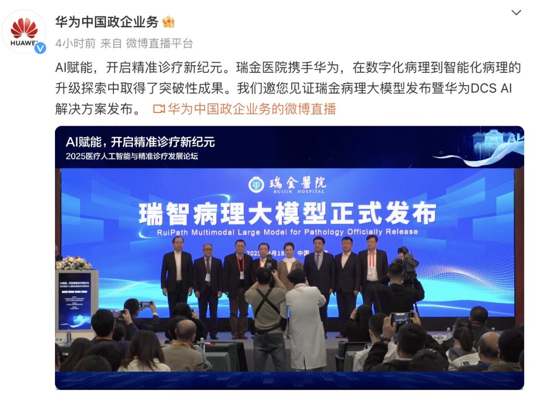DeepSeek引发了市场对AI医疗的关注度,而华为和瑞金医院正式发布AI病理大模型,为行业再添一把火。 2月18日,记者从华为官方了解到,在当天的2025医疗人工智能与精准诊疗发展论坛上,瑞金医院与华为共同发布了“瑞智病理大模型”。 业内人士指出,AI突破性进展推动医学诊疗从传统经验医学跨越至精准医学。随着AI在病理诊断领域应用加深,有望显著提升病理切片诊断效率和准确性,为临床治疗提供更精准的决策支持。 华为正式发布AI病理大模型 2月18日,记者从华为官方获悉,在2025医疗人工智能与精准诊疗发展论坛上,瑞金医院与华为共同发布了“瑞智病理大模型”。 作为全国病理诊断量最大的科室之一,瑞金医院病理科通过深度挖掘数字切片临床应用价值、深度融合AI工作流,积极实践从数字化到智慧化的全面升级。瑞金医院在病理科前瞻性提出“三位一体-OneSolution”建设目标:依托医疗数据基础设施扎牢底层基础;构建基于WSI全数字病理切片的数字化阅片工作平台,实现在线阅片;引入智慧病理辅助诊断算法实现AI辅助诊断落地应用。 据了解,该大模型不仅融合了多模态数据,还结合了中国人群的疾病特征,能够为医生提供更精准、更高效的辅助诊断支持。同时,该病理大模型能够覆盖肺癌、乳腺癌、结直肠癌、胃癌等占中国每年全癌种发病人数90%的常见癌种。 而在2月14日,百川智能宣布,由北京儿童医院与北京百川智能科技有限公司、小儿方健康科技(北京)有限公司联合研发的“AI儿科医生”在经过北京儿童医院近一个月的内测并得到专家认可后,日前正式“上岗”。 据悉,在2月13日国家儿童医学中心首都医科大学附属北京儿童医院首次开展的“AI儿科医生+多学科专家”双医并行多学科会诊活动上,基于Baichuan M1大模型打造的“AI儿科医生”,与来自耳鼻咽喉头颈外科、肿瘤外科、肿瘤内科等科室的13位知名专家并行会诊,并给出了与专家组会诊结果高度吻合的建议。 开源证券认为,随着AI技术的迅猛发展,其在医疗领域正展现出较大的应用潜力。AI凭借对海量医疗数据的深度挖掘与分析,借助先进的大模型技术,能够显著提升疾病诊断的准确性。通过对各类临床症状、检验报告等数据的快速处理与分析,AI可以在短时间内为医生提供精准的诊断建议,大大缩短诊断所需的时间,从而提高诊断效率。 不仅如此,AI还能够在疾病早期阶段就发出预警。通过对患者长期的健康数据监测,包括日常健康指标、生活习惯等信息,AI可以敏锐地捕捉到身体细微变化所蕴含的疾病风险信号,在疾病尚未出现明显症状时,就提醒医生和患者采取相应的预防措施,为疾病的早期干预争取宝贵时间。 AI医疗概念股受关注 今年春节期间,DeepSeek爆火出圈,引发了资本市场对AI概念投资热潮,该热潮更是延伸到了AI医疗领域。 华西证券研报认为,AI医疗最网红的公司之一――Tempus AI 的股价已飙升近99%,震撼全球资本市场,实力诠释AI医疗行业火热的发展态势。Tempus专注于利用AI推动精准医疗的发展,产品和服务分为三大产品线:基因组学、数据与服务以及人工智能应用。在中国市场,近年来,AI医疗市场规模持续扩大。而DeepSeek通过底层优化和软硬件协同优化大幅提升算力利用效率,降低训练与推理成本。为资金不充裕的医疗公司提供了接入AI的可能性,尤其是慢病管理、医疗信息化及医疗数据积累丰富的公司,在开源情况下具有先发优势。 Wind行情数据显示,智慧医疗指数春节后最大涨幅超过30%。不过,今日该指数大幅下挫,收跌超5%,部分热门股票出现跳水,思创医惠跌超13%,迪安诊断、嘉和美康、祥生医疗、泓博医药等跌超10%,贝瑞基因、润达医疗等跌停。 据Wind数据显示, AI医疗板块中的安必平2月以来累计涨幅接近100%,涨幅排名第一。在近期的调研纪要中,安必平表示,AI在病理诊断中的核心价值主要体现在两方面:一是诊断效率提升,通过AI辅助缩短病理医生培训周期,降低基层医院诊断门槛;二是成本控制,如抗体质检,公司探索用AI优化内部生产质检流程,减少人力依赖,未来有望降低抗体研发成本。 目前我国病理行业发展面临病理医生缺乏、分布不均匀、培养周期漫长等特点。“自动化、标准化、数字化、智能化”已成为病理科发展的必然趋势。安必平表示,AI辅助诊断在2024年11月首次被列入国家医保局立项指南,目前已发布的主要是体现在放射检查、超声检查和康复类项目,立项指南编制还将扩围至检验病理类,加之此前国家卫生健康委、国家中医药局、国家疾控局联合发布的《卫生健康行业人工智能应用场景参考指引》也已经涵盖了人工智能在病理切片诊断的应用场景,这将极大促进病理数字化和智能化的发展。 对于今日华为和瑞金医院共同发布的大模型,安必平昨日晚间发布公告称,公司并未参与瑞金病理大模型的研究与开发。公司于2022年5月与华为技术有限公司签署《基于N腾AI硬件平台的组织学病理诊断合同备忘录》,合作意向内容包括探索病理影像原生可信AI与可解释AI技术。截至本公告披露日,双方合作并未形成具体产品。 迪安诊断自2月以来,截至2月17日收盘,累计涨幅接近90%。不过,今日公司股价大幅走低,收跌超11%。迪安诊断近日在接受投资者调研时表示,公司围绕健康的全生命周期向不同领域的客户提供AI及大数据管理的相关服务。在诊断领域,公司自2021年起,从病理
