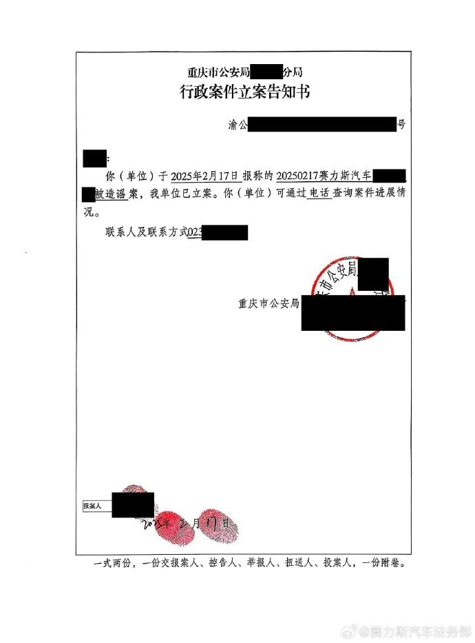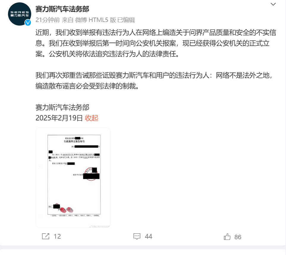 凤凰网科技讯 2月19日,赛力斯法务部发文称,近期收到举报有人在网络上编造不实信息。赛力斯在收到举报后第一时间向公安机关报案,现已经获得公安机关的正式立案。