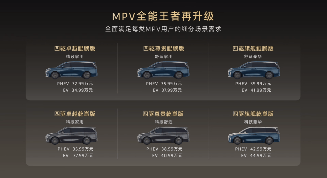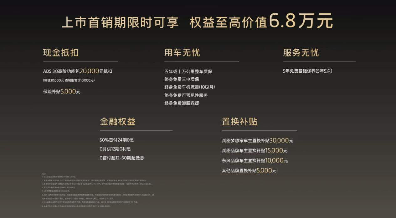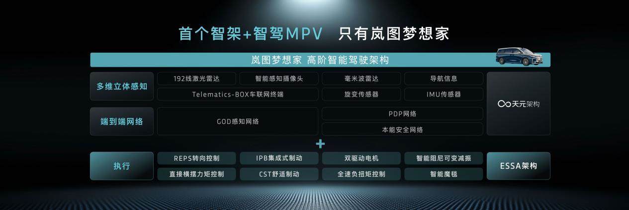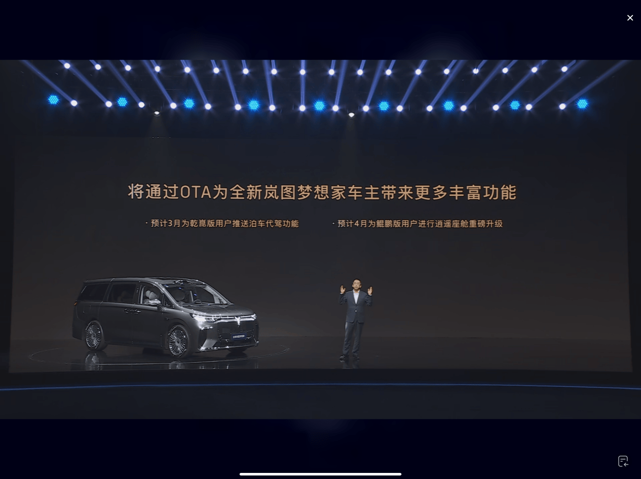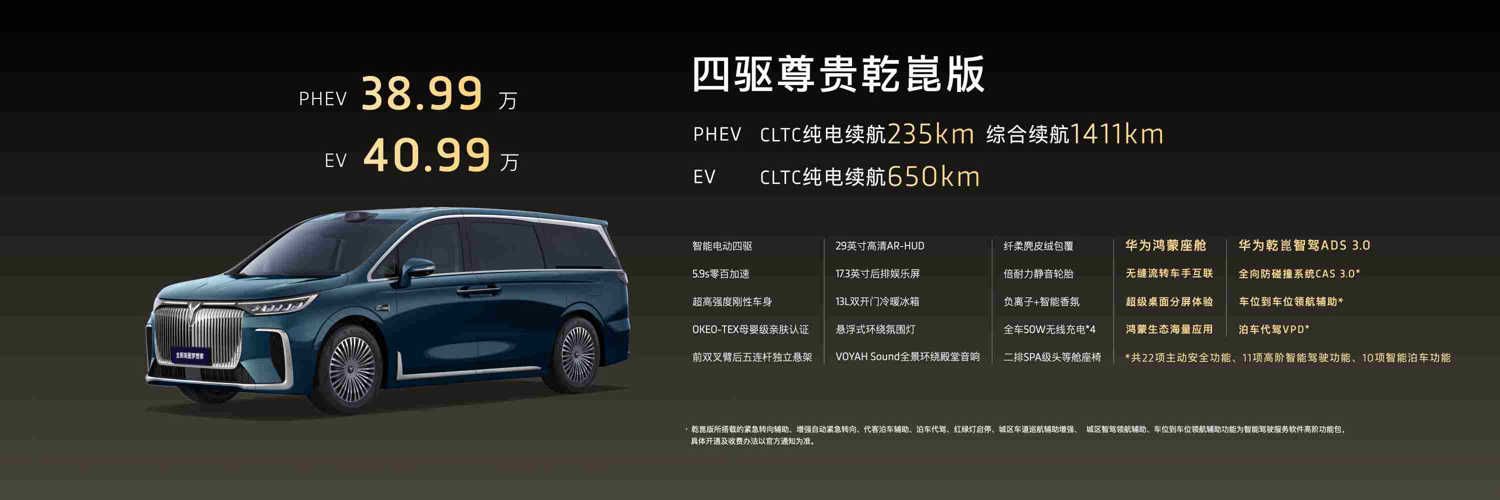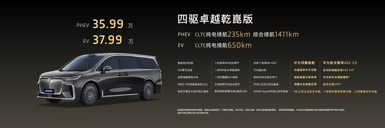 凤凰网科技讯 2月19日,岚图汽车正式发布全新岚图梦想家四驱卓越乾版与四驱尊贵乾版,以及一款全新车漆-宸星灰。 其中,插混动力的四驱卓越乾版售价为35.99万,纯电版为37.99万。搭载华为乾智驾ADS 3.0、鸿蒙座舱及AR-HUD,配备前排座椅按摩通风加热。 插混动力的四驱尊贵乾版售价为38.99万,纯电版为40.99万。在四驱尊贵鲲鹏版基础上新增华为乾智驾ADS3.0、鸿蒙座舱,并增加静音轮胎、麂皮绒顶棚、负离子+香氛系统。 核心亮点:智驾+智架 两款车型均搭载华为ADS 3.0。在首销期内(2月19日-3月31日)ADS 3.0高阶功能包,限时售价1万元 ADS 3.0高阶功能包 通勤:掉头、环岛、大曲率弯道、避让; 泊车代驾:自主找停车位、一键召唤到车主上车点、远程挪车; 车位到车位:无需记忆车位,首次即用。 在主动安全方面,基于华为ADS 3.0,该车做到了自动紧急刹车(AEB) 120km/h刹停的表现。同时还具备自动紧急转向(最高80km/h)、异形障碍物防碰撞(静止纸箱95km/h)、前向横穿碰撞制动、后向主动安全(刹停15km/h)等功能。 云瞰功能,可调用车内、车外的摄像头,实现远程查看车辆内部及车外画面的功能。 市场与定位 全新岚图梦想家主要面向“精英大家庭”的中高端家庭消费群体。其中,搭载华为智驾的乾版车型,占到了销量的40%。 值得注意的是,乾版车型的泊车代驾功能目前暂不可用,预计在3月份,通过OTA的方式进行推送。同时鲲鹏版车型的逍遥座舱,也将在4月份迎来较大更新。 (责任编辑:贺 )