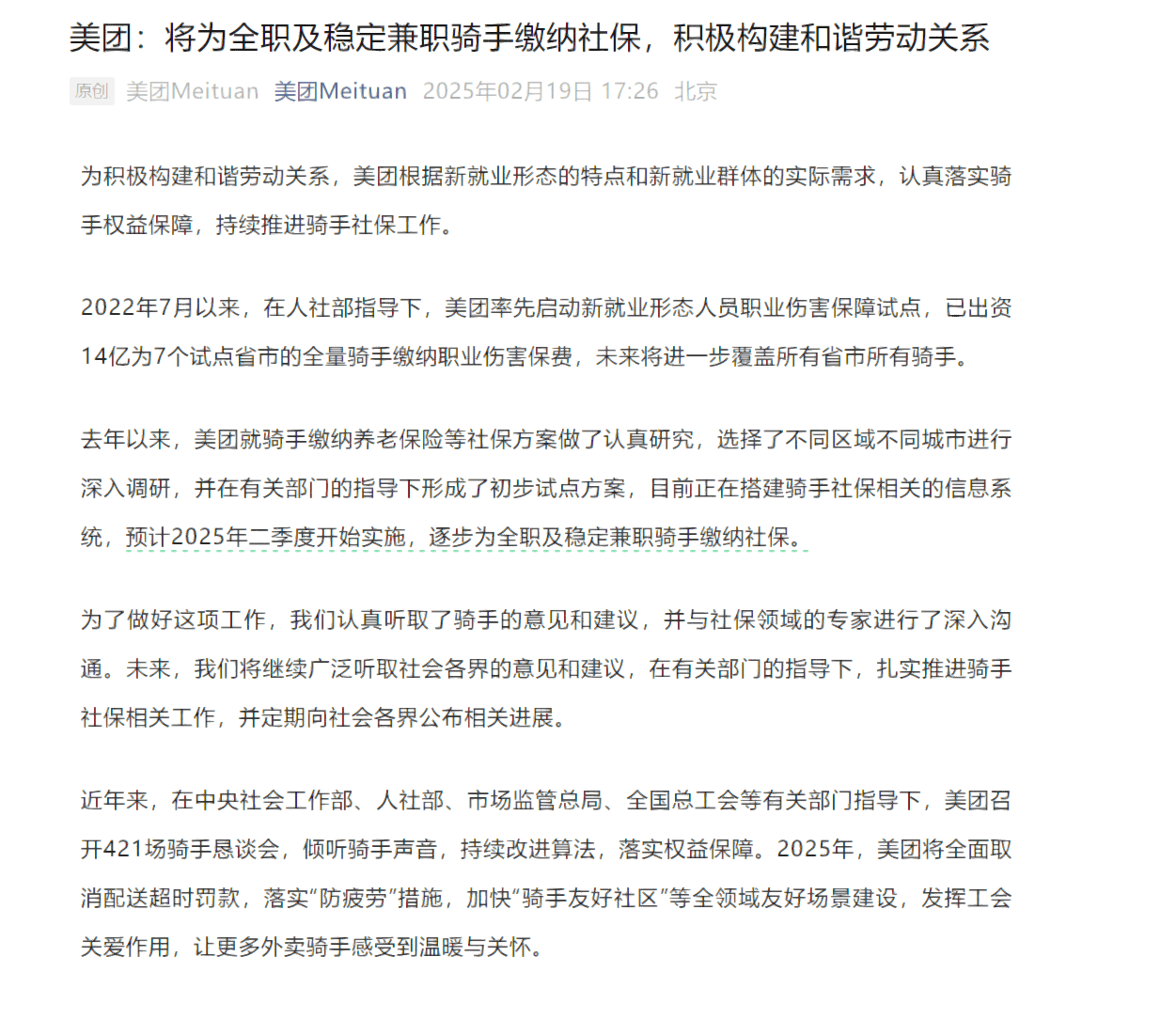 凤凰网科技讯 2月19日,美团公众号发文称,目前正在搭建骑手社保相关的信息系统,预计2025年二季度开始实施,逐步为全职及稳定兼职骑手缴纳社保。 美团表示,为积极构建和谐劳动关系,美团根据新就业形态的特点和新就业群体的实际需求,认真落实骑手权益保障,持续推进骑手社保工作。 美团表示,2022年7月以来,在人社部指导下,美团率先启动新就业形态人员职业伤害保障试点,已出资14亿为7个试点省市的全量骑手缴纳职业伤害保费,未来将进一步覆盖所有省市所有骑手。 去年以来,美团就骑手缴纳养老保险等社保方案做了认真研究,选择了不同区域不同城市进行深入调研,并在有关部门的指导下形成了初步试点方案。 (责任编辑:刘静 HZ010)