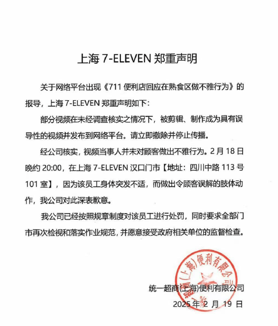 2月20日上午消息,2月18日,有网友发视频称,在上海外滩旁一家711便利店看到店员在熟食区掏裤裆做不雅行为,“网曝711店员熟食区做不雅行为”话题登上热搜。对此,2月19日,711官方发布声明回应称,“经公司核实,视频当事人并未对顾客做出不雅行为。因为该员工身体突发不适,而做出令顾客误解的肢体动作,我公司对此深表歉意。我公司已经按照规章制度对该员工进行处罚,同时要求全部门市再次检视和落实作业规范,并愿意接受政府相关单位的监督检查。” (责任编辑:宋政 HN002)