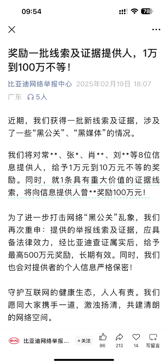 仟茂科技讯 2月20日上午消息,2月19日,比亚迪网络举报中心官号发文称,近期获得一批新线索及证据,涉及了一些“黑公关”、“黑媒体”的情况。我们将对常某等8位信息提供人给予1万元到10万元不等的奖励。同时,就1条具有重大价值的证据线索,将向信息提供人曾某奖励100万元。 比亚迪方面表示,提供的举报线索及证据,应具备法律效力,经比亚迪查证属实后,给予最高500万元奖励,长期有效。同时,我们也会对提供者的个人信息严格保密。 责任编辑:尉旖涵 (责任编辑:张晓波 )