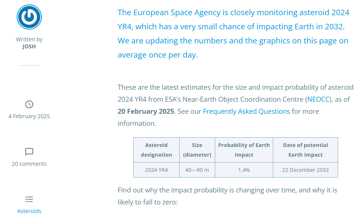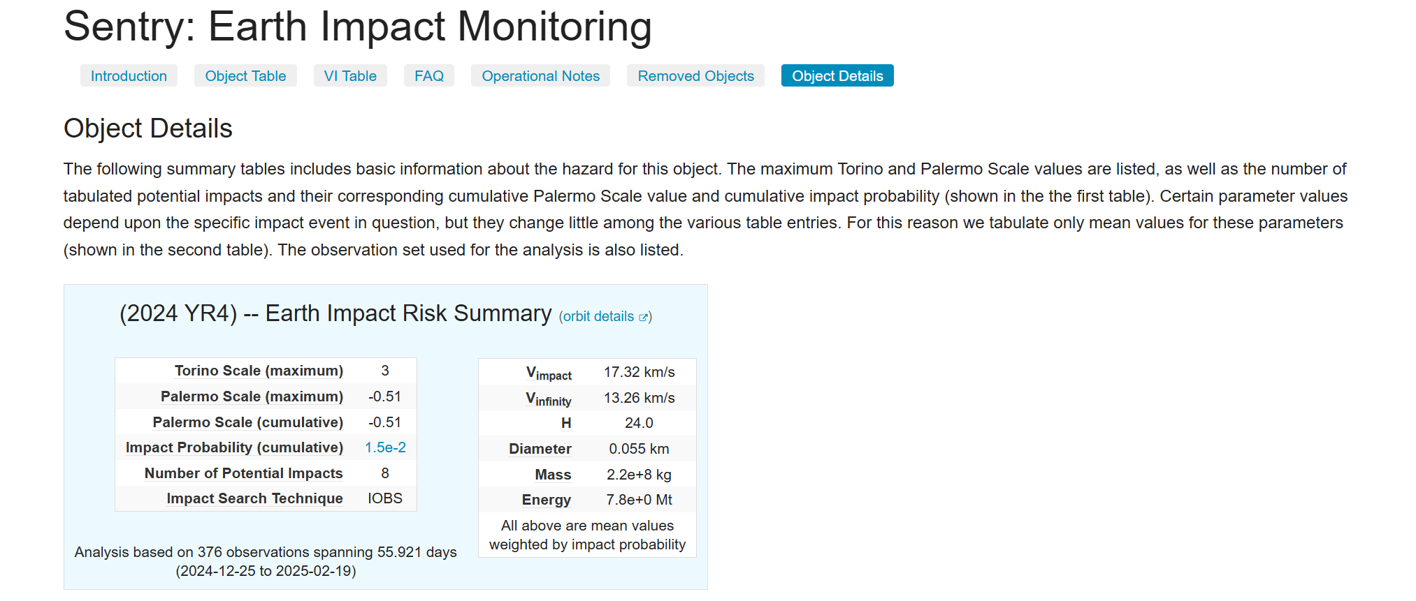 凤凰网科技讯 (作者/陈俊熹)2月20日,NASA和欧洲行星防御办公室(ESA)同时将小行星2024 YR4撞击地球的概率下调。NASA最新数据显示,该概率已从3.1%降至1.5%;ESA最新数据显示,该概率从2.8%降至1.4%。 图源NASA 图源ESA 昨日,NASA曾将小行星2024 YR4撞击地球概率上调至3.1%,这使该小行星成为现代预测史上威胁最大的陨石。上一个纪录是2004年的Apophis小行星,当时它在2029年撞击地球的概率曾短暂达到2.7%。 (责任编辑:刘畅 )