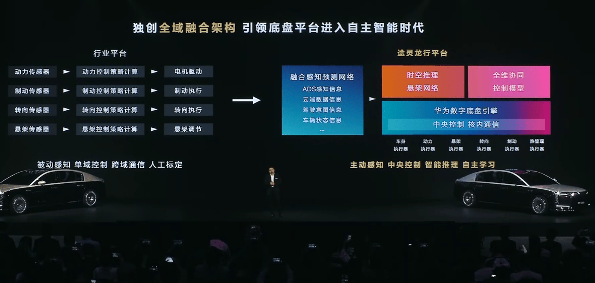 凤凰网科技讯 2月20日消息,在今日下午的鸿蒙智行尊界技术发布会上,尊界S800 首发搭载的途灵龙行平台正式亮相。该平台独创全域融合架构,号称行业首个自主智能数字底盘平台。 途灵龙行平台是一个分布式的数控柔性平台,采用分布式电驱,支持 7000-12000N?m 扭矩输出,支持半主动和全主动悬架,适配轿车、SUV、MPV 等多车型。平台支持全维融合感知,可实时构建道路空间模型,特征物识别升级为连续空间模型构建,宣称路况空间模型的分辨率提升 100 倍,适配全路况、全天候、全场景。 另外,途灵龙行平台提供域控六合一控制,包括车身控制、动力控制、悬架控制、转向控制、制动控制、热管理;协同控制器件数提升 5 倍,端到端调度能力提升 10 倍、处理能力提升 10 倍,最小决策链路时延<1ms。 余承东表示,尊界 S800 将实现从“被动智能”到“自主智能”的全新跃迁。新车首发的六大智能化技术中,途灵龙行平台便是其中之一,此外还有天使座主动安全防护、华为星河通信,以及迎来迭代的鸿蒙 ALPS 座舱 2.0、华为车语系统 2.0、华为巨鲸电池 2.0。 途灵龙行平台的发布,为智能汽车领域带来全新变革,后续表现值得关注 (责任编辑:刘静 HZ010)