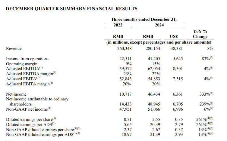 凤凰网科技讯 2月20日,阿里巴巴发布2024年12月份季度业绩,2025财年第三季度(截至2024年12月31日止季度)营收2,801.5亿元人民币,同比增长8%,预估2,773.7亿元人民币;第三季度调整后EBITDA 620.5亿元人民币。 归属于普通股股东的净利润为人民币489.45亿元(67.05亿美元)。净利润为人民币464.34亿元(63.61亿美元),同比增长333%。摊薄每股美国存托股收益为人民币20.39元(2.79美元)及摊薄每股收益为人民币2.55元(0.35美元或2.75港元)。非公认会计准则摊薄每股美国存托股收益为人民币21.39元(2.93美元),同比增长13%。 (责任编辑:董萍萍 )