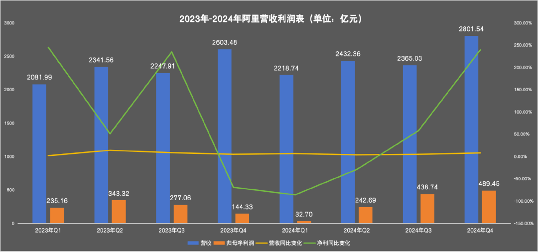 阿里2025三大战役:AI、电商、即时零售。 定焦One(dingjiaoone)原创 作者 | 苏琦 编辑 | 魏佳 2025年开年,阿里大有“翻身”之势。 春节是电商的销售淡季,阿里却因为AI频繁出圈。先是受DeepSeek影响,同为开源大模型的阿里通义千问(Qwen)受到关注;接着大年初一(1月29日),阿里发布最新模型Qwen2.5-Max,经评测,性能超越DeepSeek V3。 开工后,2月11日,阿里和苹果就AI业务达成合作的重磅消息传出,市场对阿里的热情再上一个台阶。 AI是马云讲了多年的故事,如今阿里终于靠着风光了一把。对内,智能云集团扛起公司利润增长的大旗;对外,AI让阿里股价止住了下跌势头,自Qwen最新大模型发布后,阿里股价上涨超36%,最新收盘价为120.9港元/股,市值暴涨8000亿港元,达2.3万亿港元。 AI也是吴泳铭大力推行的方向。自他2023年9月担任阿里巴巴集团CEO以来,确定了两大战略“用户优先”和“AI驱动”,并在整个2024年对阿里进行多次调整。 2月20日,阿里最新发布的财报,就是对这一年成果的检验。 财报显示,2024年Q4阿里表现稳健,营收同比增长8%至2801.54亿元,归母净利润同比上升239.12%至489.45亿元。而2024年全年,阿里营收9817.67亿元,归母净利润2203亿元。 2月17日,马云出现在一场重磅的民营企业座谈会上,共同参会的还有科技、制造、零售行业的一众明星民营企业家。这被外界视为阿里“重新启程、转守为攻”的标志。 回归主营电商、几经调整之后的阿里,在开年由AI业务带来了新气象。电商业务能否在2025年创造增长,非核心业务会在2025年有何表现?不妨拭目以待。 阿里缓过来了 从2024年的营收来看,阿里各季度收入表现都优于2023年,但增长不多,平均增幅在5%左右。 目前阿里生态包括五纵二横,五纵为中国商业(营收占比43.99%)、国际商业(营收占比12.20%)、本地生活(营收占比5.49%)、大文娱(营收占比1.76%)和其他(营收占比17.17%),二横指的是菜鸟物流(营收占比9.13%)和云智能(营收占比10.26%)两大基础设施业务。除其他业务,营收占比排在前三的依次是淘天集团、国际数字商业、云智能。 这七大业务,可以划成三大层级来看。 第一是云智能和国际商业,它们是当之无愧的增长引擎,一个保利润增长、一个保收入增长,成为核心驱动力。 其中云智能集团在2024年前三个季度都是七大业务中保持盈利且利润增速最快的业务,同比增长分别为45%、155%和89%。到2024年第四季度,云智能集团依旧盈利,经调整EBITA为31.38亿元,同比增长33%,增速排到第三。 对于利润下降的原因,财报解释称,部分利润被客户增长和技术投入增加所抵销。从阿里云春节发布的最新大模型来看,背后投入应该不少。 另外,蒋凡带领的国际数字商业集团在2024年连续四个季度收入增速最高,同比增长分别为45%、32%、29%和32%,主要是由速卖通和Trendyol(土耳其电商零售平台)的收入增长所驱动。 其次是以淘天集团为核心的中国商业,它是阿里2024年压力最大、调整最大的业务。其收入同比增速在2024年四个季度几乎都陷入了停滞,分别为4%、-1%、1%和5%。 阿里此前为了抵抗对手竞争,跟进了低价策略,带来的结果是广告费用和佣金费用涨不动了,这使得阿里的客户管理收入直线下降。阿里给出的办法是,通过调整收费政策增加收入,宣布自2024年9月起,将原来的固定收费调整成动态按GMV收费。 这一系列调整确实起到了效果,因为线上GMV增长和Take rate(收入率)同比提升(得益于基础软件服务费的影响),阿里的客户管理收入从2024年年中的1%增速变成年末的9%。但这一增速依旧排在七大集团的倒数第二位,淘天集团还有一场硬仗要打。 第三是包含高德和饿了么在内的本地生活集团,面临着扭亏和应对行业竞争的重任。 本地生活业务在2024年四个季度的收入增幅一直排在前三,但是连续十多个季度仅减亏未扭亏,背后原因是行业竞争加剧,补贴、投放等成本一直不低。不过,2024年第四季度,其经调整EBITA为亏损5.96亿元,与2023年同期的亏损21亿元相比已经大幅缩小,该集团或许有望在2025年转亏为盈。 今年即时零售赛道越发火热,本地生活业务需要承担竞争压力。 整体来看,2024年的阿里已经缓过来了: 利润方面,挽回了第一季度归母净利润暴跌的颓势,在第三和第四季度连续创下新高,其中,淘天、智能云、菜鸟的利润在2024年Q4均创下全年新高。 业务层面,出售了一部分持续亏损的零售业务,稳住了国内电商基本盘,同时增长引擎表现亮眼。 股价层面,阿里在2025年价格持续回升,2月以来上涨超36%。 电商全球化布局与AI业务的发展,成为阿里2025年业绩增长的关键。资本市场也终于不再仅仅以电商业务来对阿里进行估值,而是转变为科技+电商。 AI多年投入终见效, 国际电商边烧钱边狂飙 此次财报,外界最为关注的,是阿里在AI方面的表现。 一方面,DeepSeek的出现让人注意到了开源大模型的竞争力,也让人意识到通义千问大模型在开源生态的地位被远远低估。另一方面,苹果选择阿里作为合作商,为中国版的iPhone开发人工智能功能,再次提振阿里的行业地位。 科技行业投资人告诉「定焦One」,苹果对供应商要求十分严格,选择阿里而非DeepSeek或其他公司,是看中其端云混合能力、客户服务能力以及大模型的多模态能力,“是更为综合的实力”。 在知名开源社区Hugging Face中,可以看到作为最早布局大模型的公司之一,阿里通义千问系列模型涵盖多种大语言模型和多模态模型。模型性能上,其
