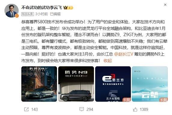 凤凰网科技讯 2月21日,比迪集团品牌及公关处总经理李云飞发微博称,恭喜华为,新平台架构与比亚迪一年前发布的架构不谋而合。 李云飞表示,恭喜尊界S800技术发布会成功举办。为了用户的安全和体验,大家在技术方向和应用上,都是一致的。华为发布的途灵龙行平台全域融合架构,和比亚迪去年1月份发布的璇玑架构整车智能,理念不谋而合。 以腾势Z9、Z9GT为例,大家用的都是三电机,都有蟹行模式,都有极致转向,都能做到高速爆胎不失稳;比亚迪有云辇主动预瞄,尊界有凌波微步,都是主动安全智能。中国科技,就是这样你追我赶,一路向前。挺好的!也请大家关注3月份,由长江总筹划的腾势N9上市发布,到时候会给大家带来很多科技惊喜。 昨日,华为举办“鸿蒙智行尊界技术发布会”,华为车BU董事长余承东官宣尊界S800首发时空推理悬架,将智能推理引入车辆控制运动。 (责任编辑:郭健东 )