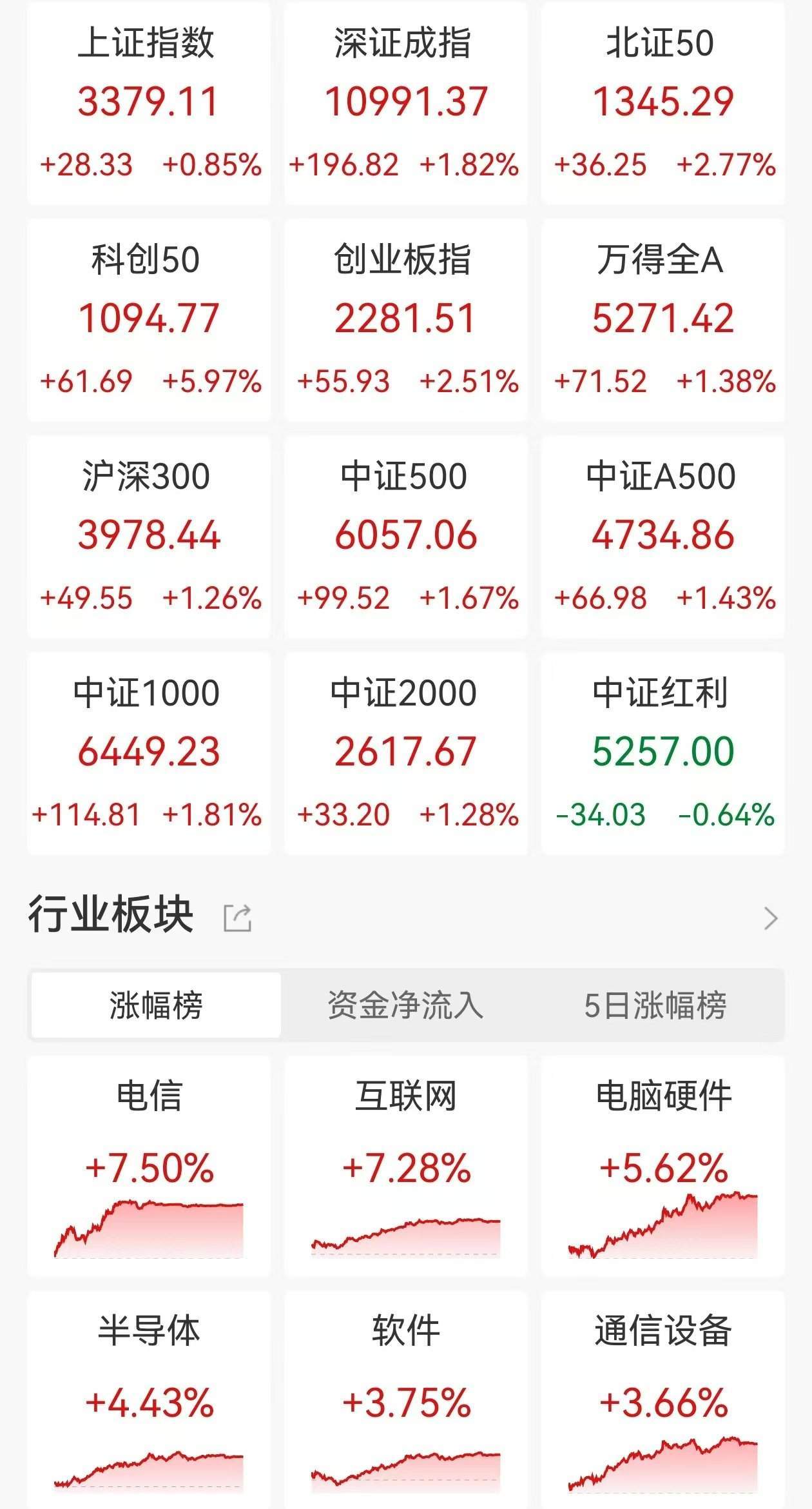 格隆汇2月21日|A股主要指数集体走高,科创50指数涨近6%;截至收盘,沪指涨0.85%报3379点,深证成指涨1.82%,创业板指涨2.51%,科创50指数涨5.97%。全天成交2.23万亿元,为时隔两个月以来首次突破2万亿元,较前一交易日增量4396亿元,全市场超2800股上涨,近2400股下跌。 盘面上,IPv6板块走高,神州泰岳(300002)等多股涨停;液冷服务器概念走强,方盛股份等近二十股涨停;工信部开展算力强基揭榜行动,算力概念掀涨停潮,寒武纪等二十余股涨停;国资云概念拉升,锐捷网络20%涨停;腾讯云、电源设备、数据中心及AI芯片等板块涨幅居前。另外,贵金属、黄金板块下挫,赤峰黄金(600988)领跌;银行板块普跌,江苏银行(600919)等多股跌超2%;珠宝首饰、石油行业及纺织服饰等板块跌幅居前。(格隆汇) (责任编辑:宋政 HN002)