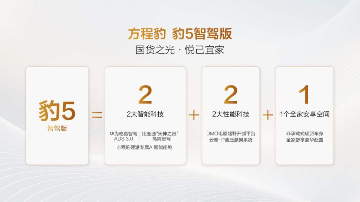 凤凰网科技讯 (作者/陈俊熹)2月21日,比亚迪发布智能化战略不久后,其旗下新能源个性品牌方程豹推出豹5智驾版,同时搭载比亚迪“天神之眼”和华为“乾智驾”两大高阶智驾系统,价格23.98万元起。 豹5智驾版是全球唯一同时搭载两大高阶智驾系统的车型,配备DMO电驱越野开创平台、云辇-P百万液压悬架系统,以及AI智能座舱。 外观上,豹5智驾版融入新能源科技元素。配备环绕式电流大灯、锁扣式保险杠与宽大体量车身,车身同色高亮的前保险杠、轮眉和侧裙,搭配车侧智驾摄像头与车顶激光雷达。 内饰方面,在保留诸多原版配置的基础上,新增后排通风加热、后排控制屏等舒适配置。其AI智能座舱功能丰富,AI智能语音可实现画画、作诗等功能,还能通过影像识别驾驶者身份和习惯,并且支持“方华”手车互联,让手机与车机深度融合。 动力上豹5智驾版依托DMO平台,最大功率达505kw,综合续航1200km,百公里亏电油耗7.8L,百公里加速仅4.8s。云辇-P百万液压悬架系统,具备阻尼、高度、刚度调节及主动预瞄、四轮联动功能。 安全性能上,豹5智驾版基于五星安全设计,主、被动安全配置齐全。华为乾智驾ADS 3.0的全向防碰撞系统CAS 3.0,以及“天神之眼”的AEB自动紧急制动,能主动监测路况、避开风险。非承载式大梁车身、超高强度笼式座舱,搭配自研刀片电池和CTC电池底盘一体化技术,保障车内人员安全。 豹5智驾版此次共发布了4大版本,包括天神智驾Max版、天神智驾Ultra版、激光乾智驾版、云辇激光乾智驾版,价格区间为23.98万元-32.98万元。 (责任编辑:董萍萍 )