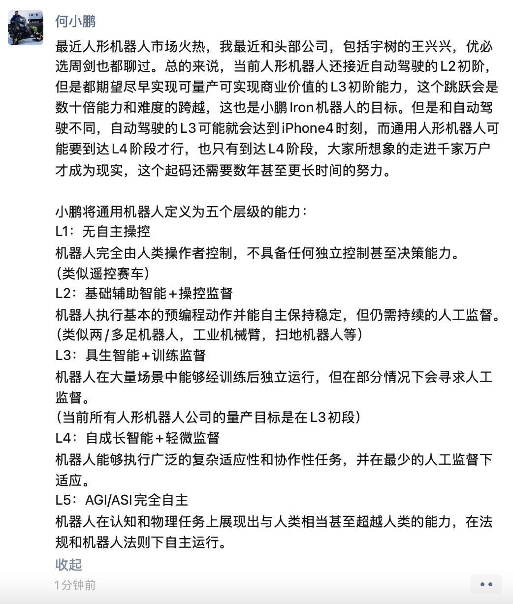 凤凰网科技 2月21日,小鹏汽车董事长兼CEO何小鹏通过朋友圈,分享了与人形机器人行业头部企业的交流成果,并阐述了小鹏对通用机器人能力的五级分层框架。何小鹏认为,当前人形机器人行业仍处于接近自动驾驶L2的初级阶段,但全行业正致力于突破技术瓶颈,尽早实现具备商业价值的L3初阶能力量产目标。 从L2到L3需“数十倍能力跨越” 何小鹏透露,近期与宇树科技创始人王兴兴、优必选科技CEO周剑等业内人士深入探讨后,一致认为,人形机器人当前能力相当于自动驾驶的L2初阶,即“基础辅助智能+操控蓝管”阶段。该阶段的机器人可执行预编程动作并保持稳定,但仍需持续人工监督。 而要实现向L3初阶的跨越――即“具身智能+训练蓝管”阶段,需解决“数十倍能力和难度”的挑战。何小鹏强调,这一阶段将是小鹏Iron机器人的核心目标,其能力表现为在大量场景中经训练后独立运行,仅部分情况下需人工介入。 人形机器人需L4才能迎“iPhone4时刻” 何小鹏类比称,自动驾驶技术达到L3阶段即可能迎来类似智能手机“iPhone4时刻”的颠覆性突破,但人形机器人需发展至L4阶段才能实现这一里程碑。在L4阶段(自成长智能+轻微监管),机器人可执行广泛复杂任务,并能在最少人工监督下自主适应环境。他认为,只有达到L4,人形机器人才能真正进入家庭场景,“这仍需数年甚至更长时间的努力”。 五级能力框架:从“遥控赛车”到完全自主何小鹏将通用机器人能力划分为五个层级: L1(无自主操控):完全依赖人工操作,如遥控赛车;L2(基础辅助智能+操控监督):工业机械臂、扫地机器人等为代表;L3(具身智能+训练监督):当前头部企业的量产目标;L4(自成长智能+轻微监督):适应复杂协作任务的关键阶段;L5(AGI/ASI完全自主):认知与物理能力超越人类,受法规约束自主运行。 小鹏机器人目标:锚定L3量产,推动商业化落地 何小鹏明确表示,小鹏Iron机器人将聚焦L3初阶能力的快速实现与量产,以推动人形机器人从实验室走向规模化应用。他同时指出,行业需理性看待技术发展节奏:“L3是当前可实现的目标,但L4才是真正打开消费市场的钥匙。” 公开资料显示,小鹏汽车近年来持续加码智能化领域布局,其机器人业务被视为继自动驾驶后的又一战略重点。此次提出的五级能力框架,或为行业技术路径与商业化进程提供参考。 (责任编辑:张晓波 )