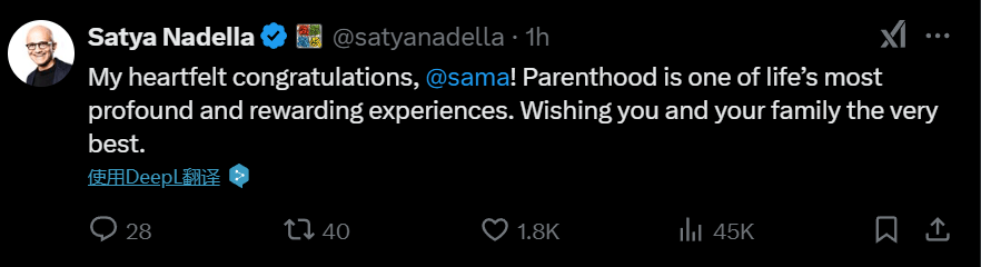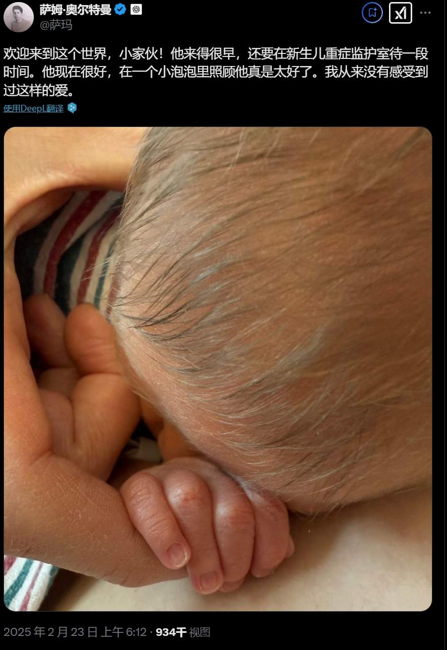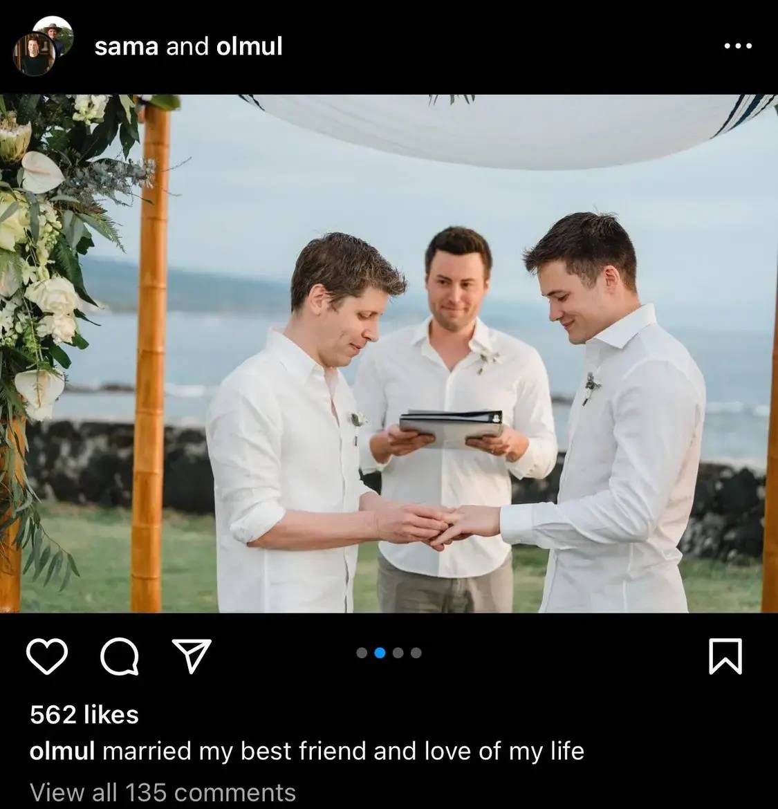 凤凰网科技讯 (作者/陈俊熹)2月23日,OpenAI创始人山姆・奥特曼在X平台上发布他刚出生孩子的照片。他说:“欢迎来到这个世界,小家伙!我从来没有感受过这样的爱。” 奥特曼十七岁时出柜为男同性恋,2024年1月,他和软件工程师奥利弗・马尔赫林以犹太礼仪方式结婚。马尔赫林曾是Meta AI部门加州总部的软件工程师,专业领域涉及人工智能与软件开发。有报道称,马尔赫林自2019年起就与奥尔特曼交往,他们平日住在加州旧金山。 婚礼现场照片 网友在评论区与奥特曼开起了玩笑。有网友说:“我以为你是同性恋,这个孩子是买的吗?” 还有网友回复称:“是的,你可以在ali express(国际版淘宝)上买到他们。” 还有网友问:“他什么时候能写prompt?” 当然,除了少部分善意的玩笑之外,许多人为奥特曼送上了祝福,比如微软CEO纳德拉:“衷心祝贺你,山姆!为人父母是人生中最深刻、最有意义的经历之一。祝你和你的家人一切顺利。” (责任编辑:张晓波 )